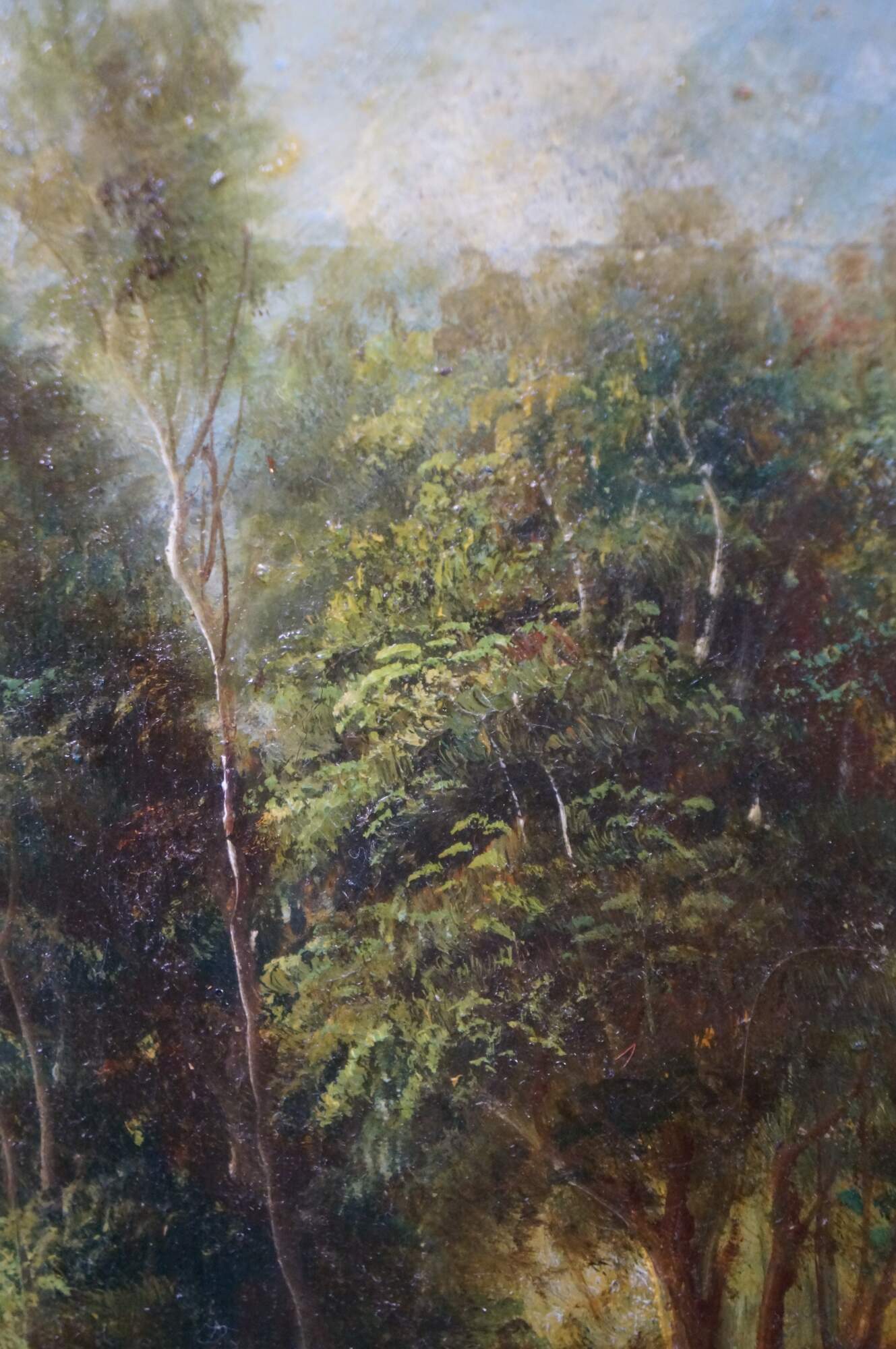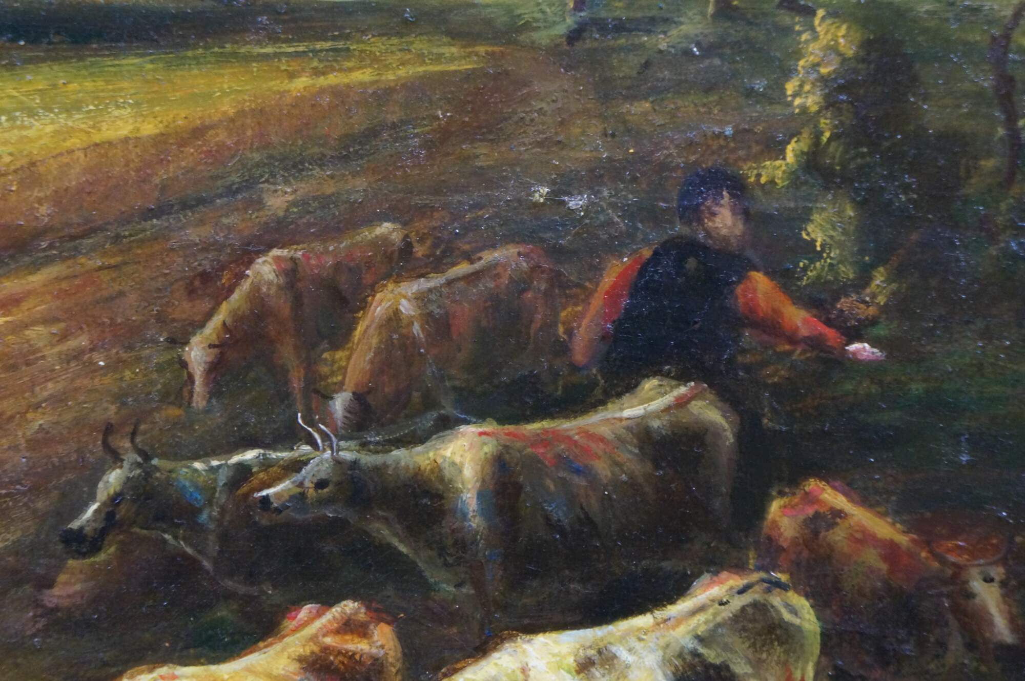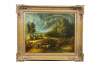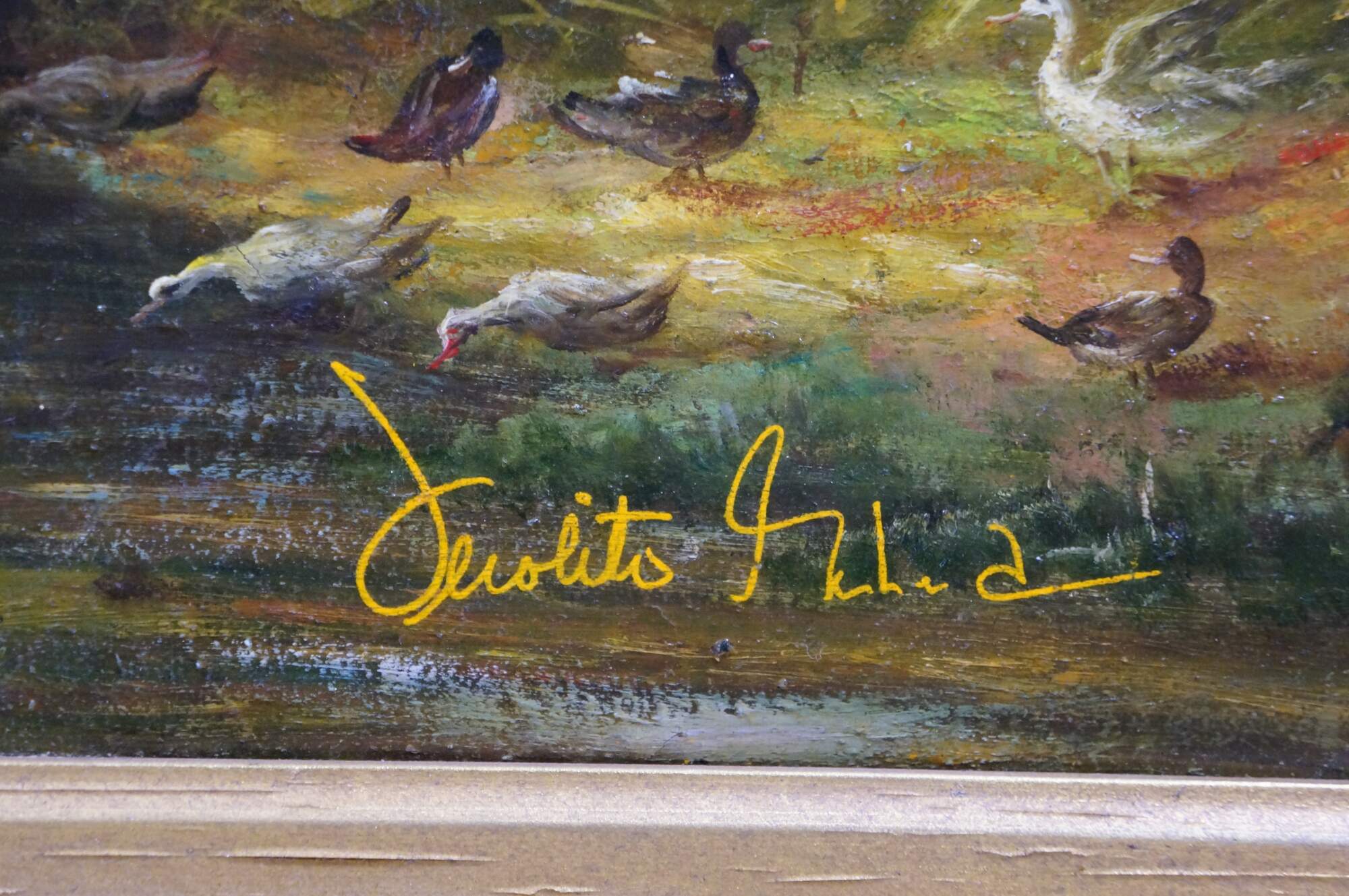 Various figures are present, including a rider on horseback, milkmaids with cows, lush trees, and geese / ducks.