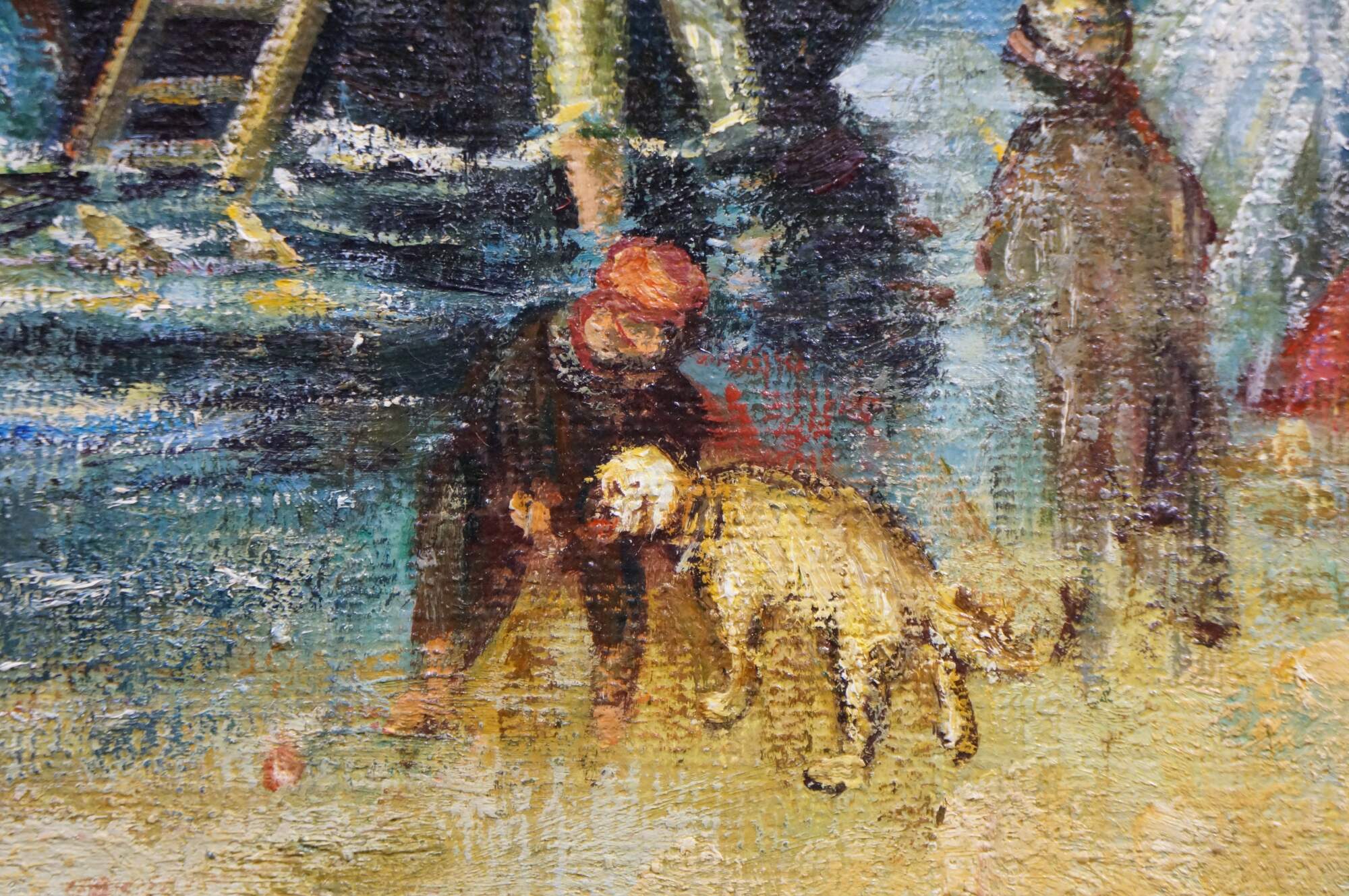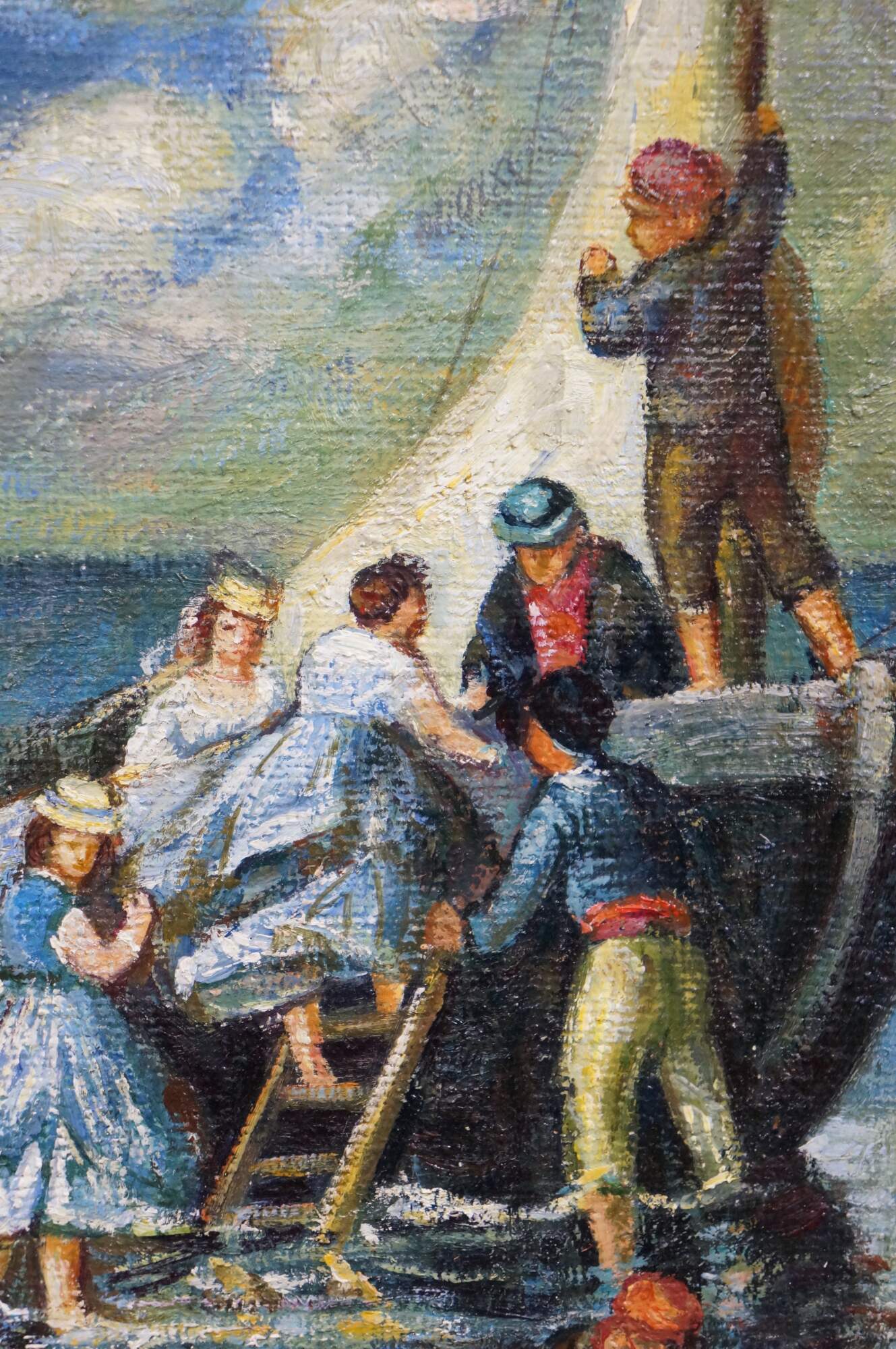 Vintage nautical / maritime / seascape oil painting on canvas titled The Return of the Boating Party after Pierre-Auguste Renoir. Originally painted around 1862, this work depicts a beach scene with figures unloading from the sailboat onto the shore.