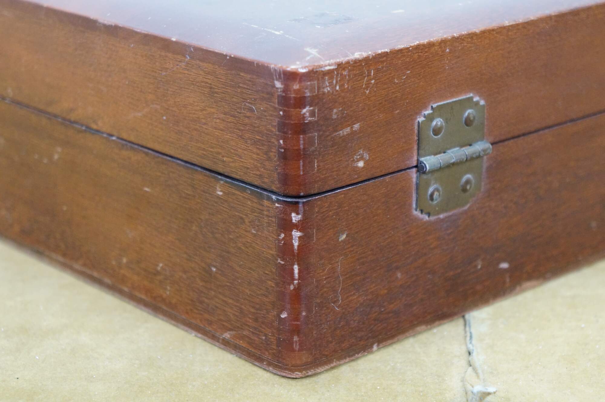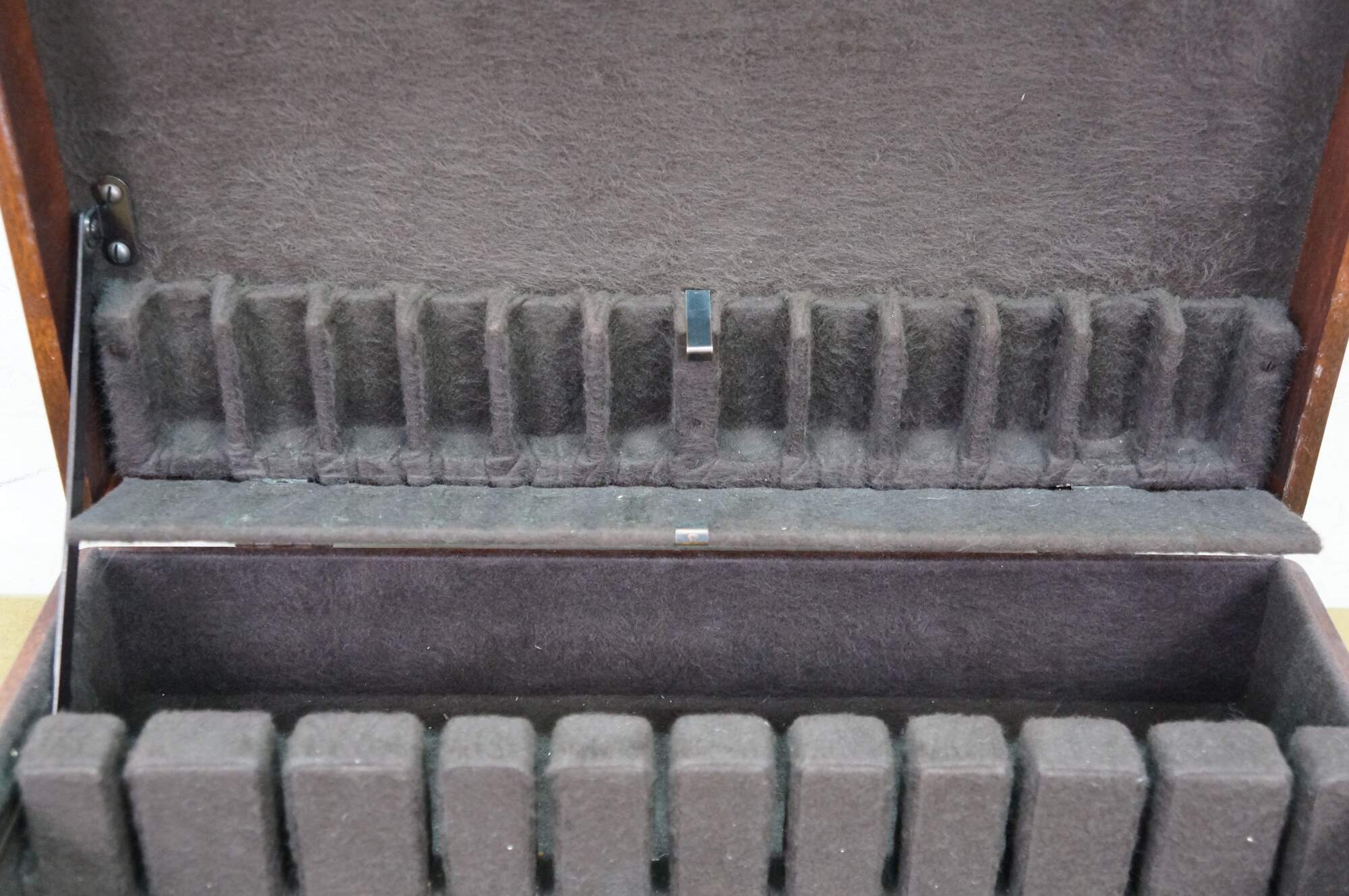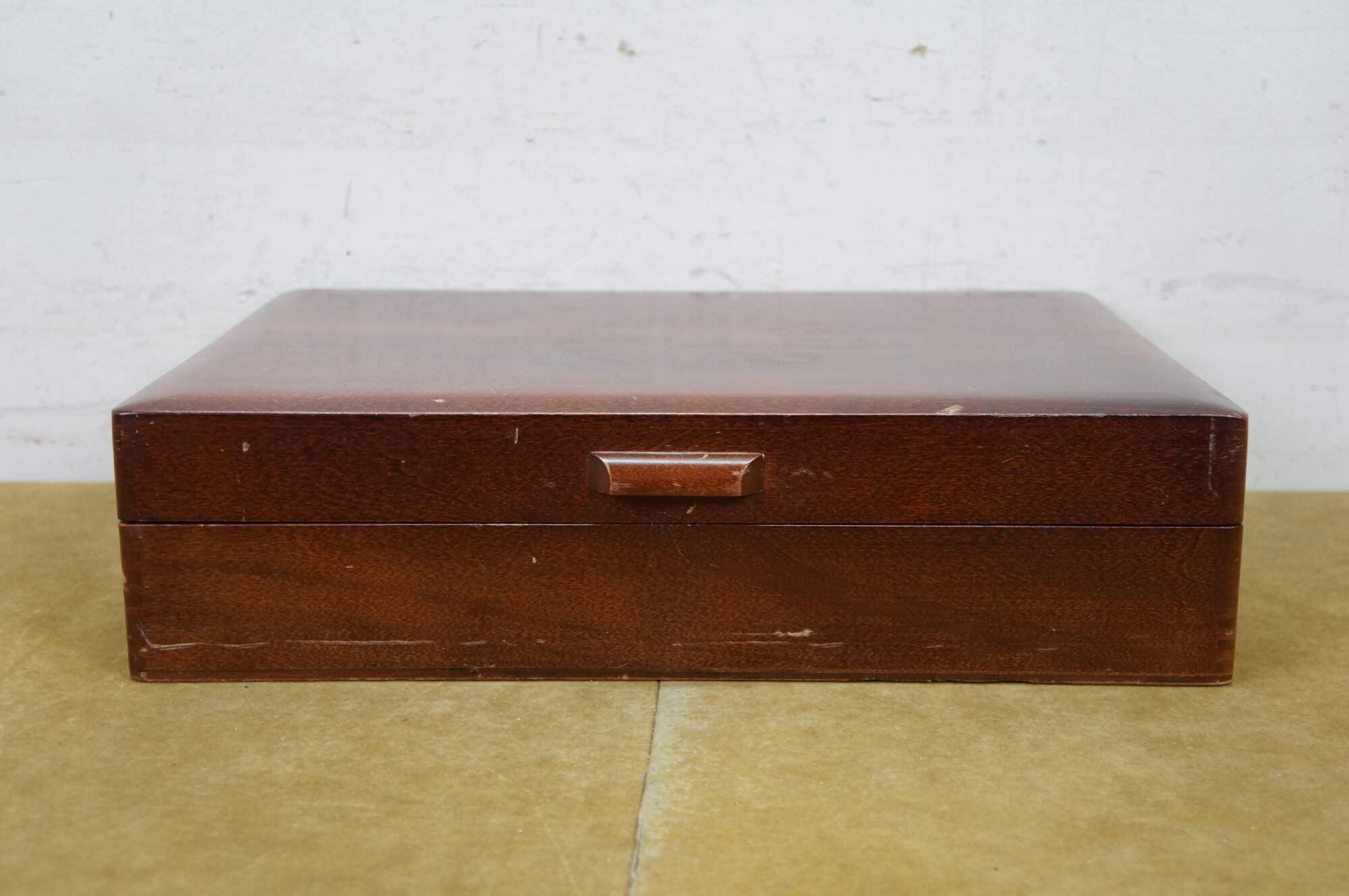 Vintage mahogany felt lined silverware flatware chest / box featuring dovetailed corners, a drop front knife compartment, and ten storage slots.