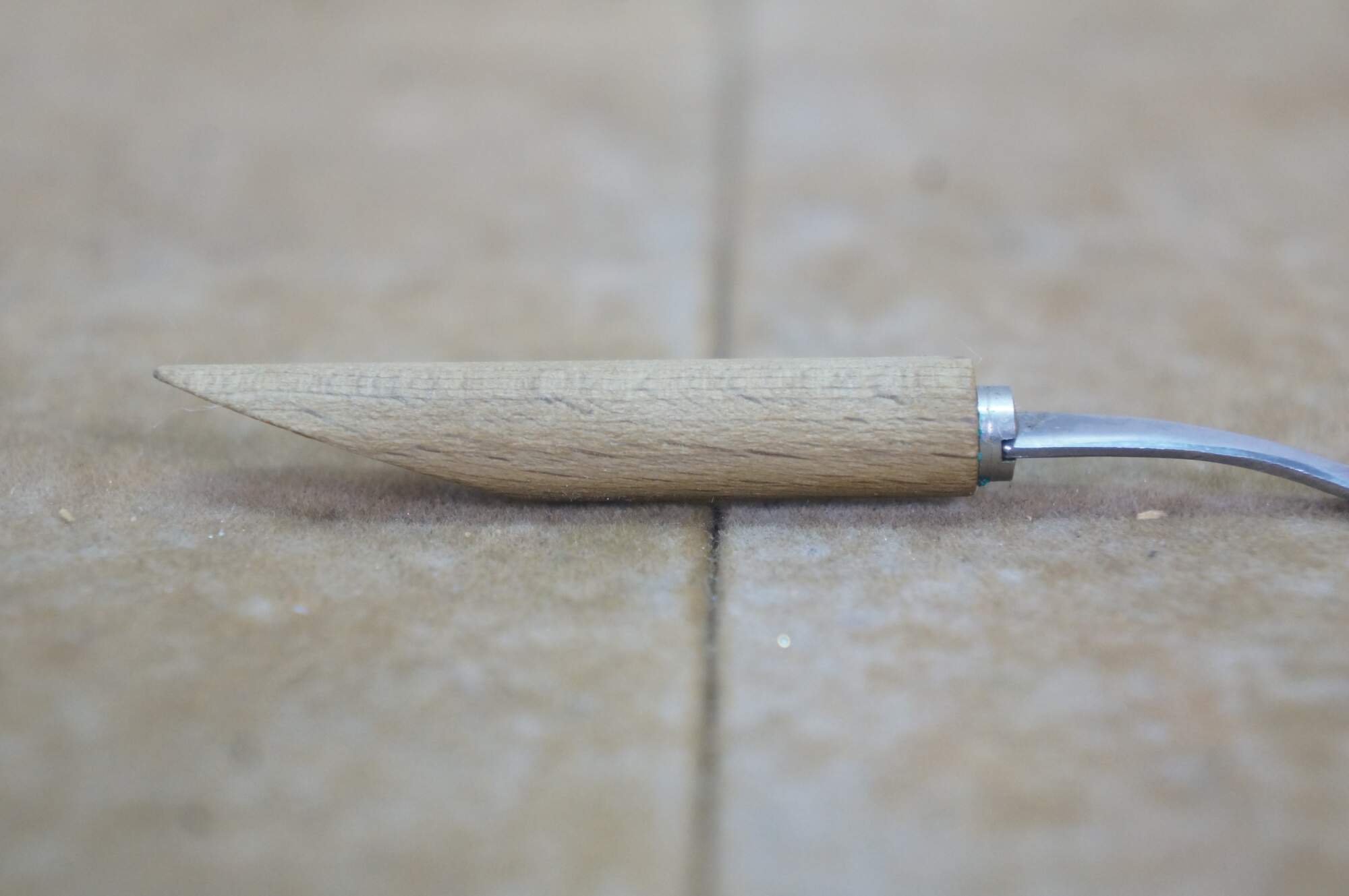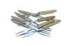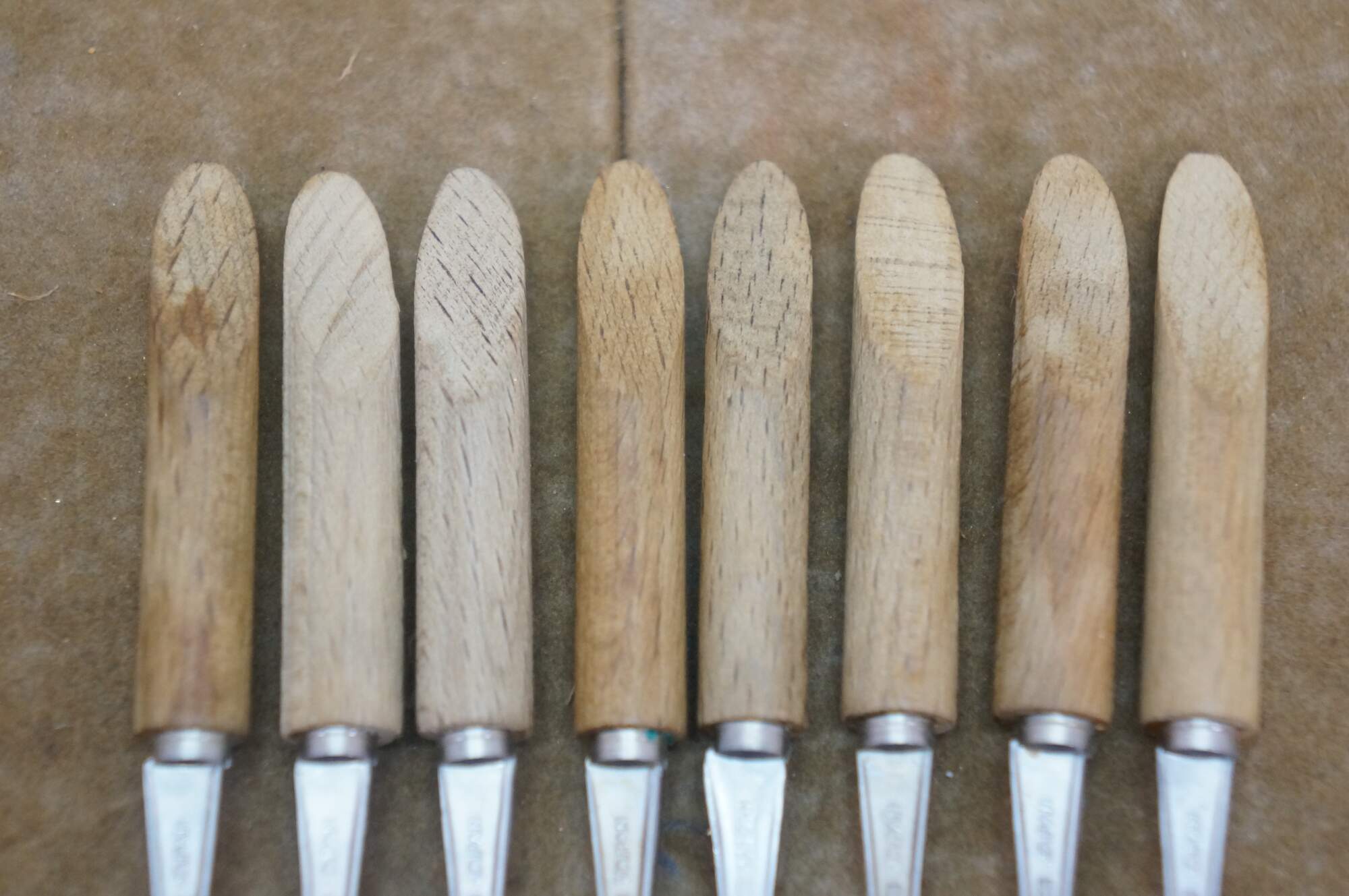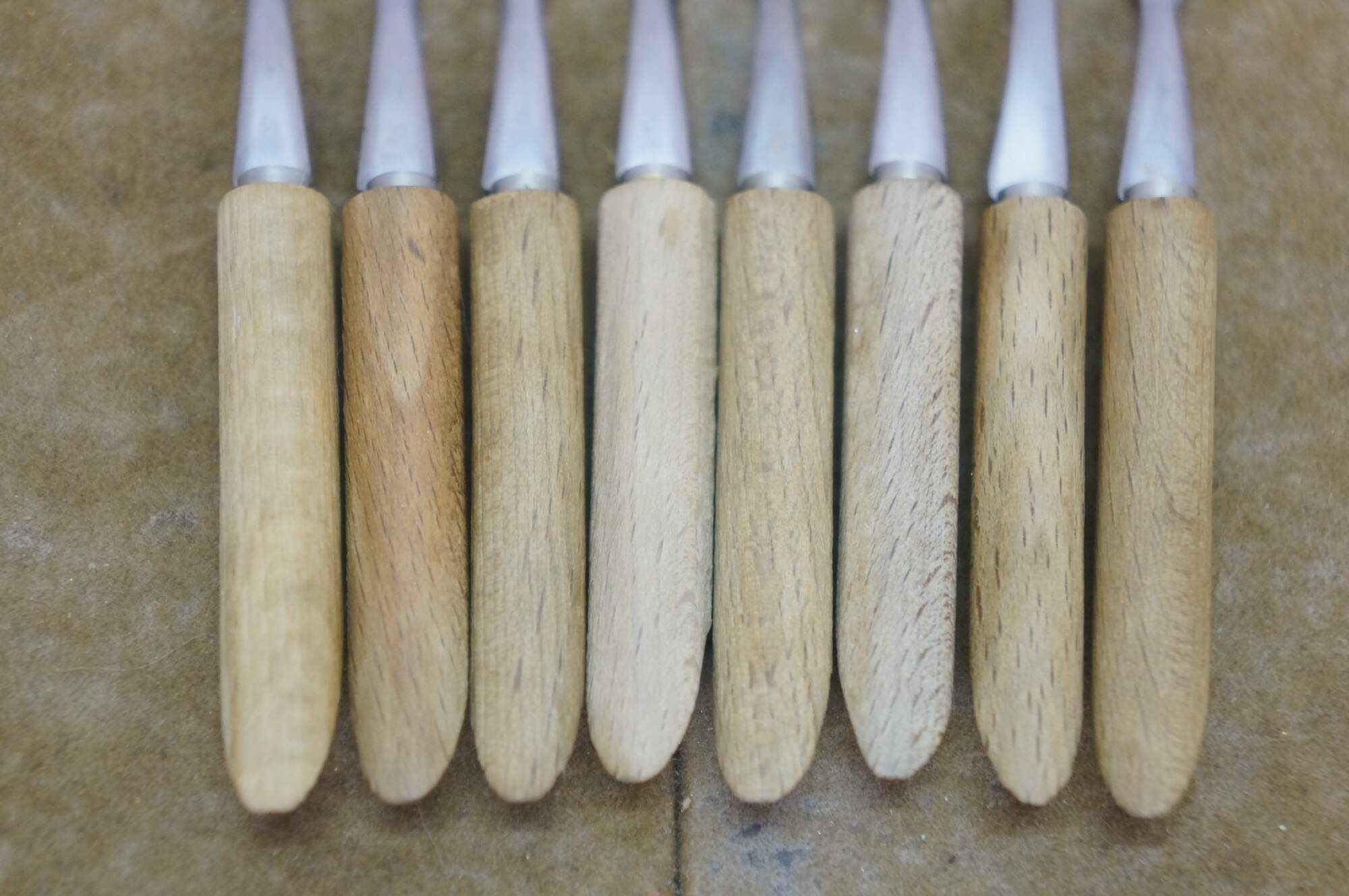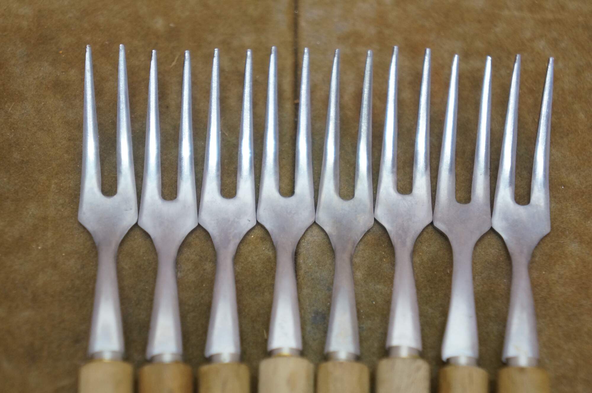 Vintage set of eight mid-century modern appetizer or cocktail forks with stainless steel two-prong tines and wooden handles, likely made in Japan.