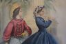 These are gorgeous piece of fine art. They are 2 petersen's magazine Les Modes Parisienne cut outs from September and October 1864 and they depict women dressed in period clothing in lovely gold frames and they were restored and colored later on. These are absolutely beautiful pieces and they would make wonderful additions to your home or collection.