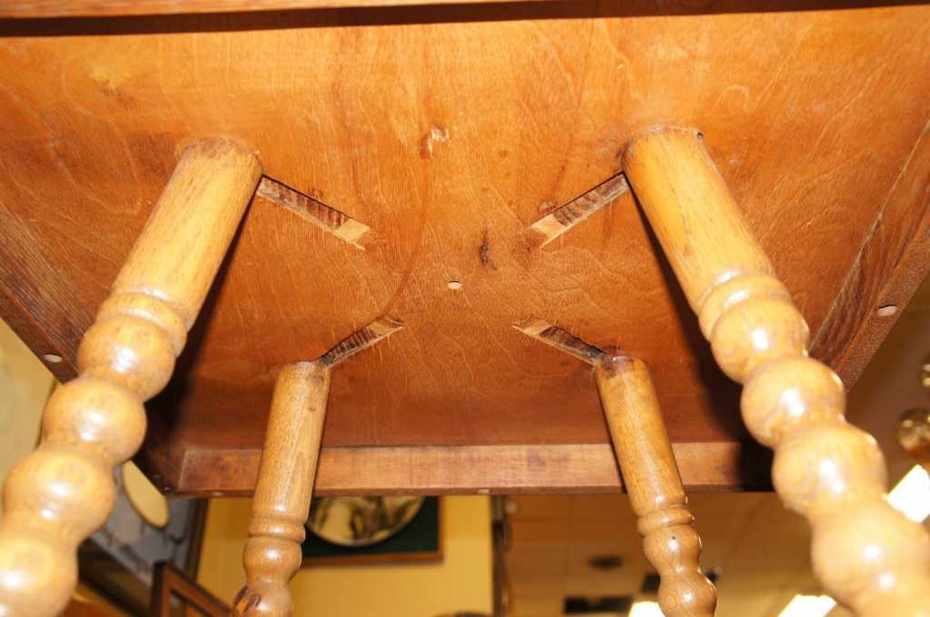 The table top has warped over the years. Otherwise light wear from use and age. There is a slight wobble in the top of he table. See Pictures