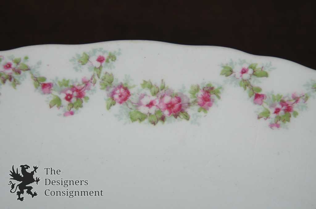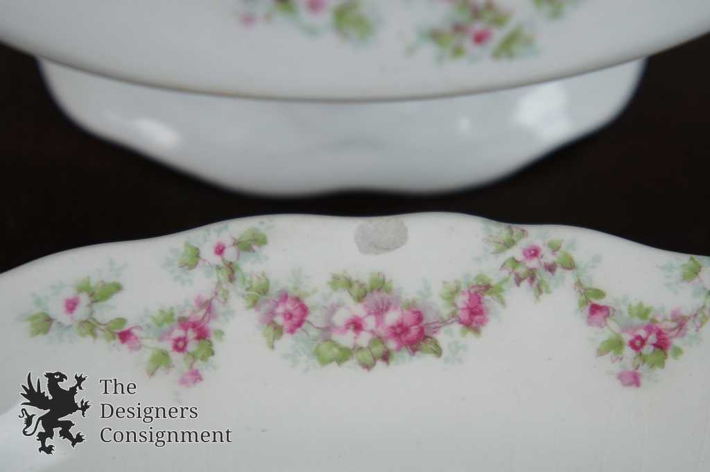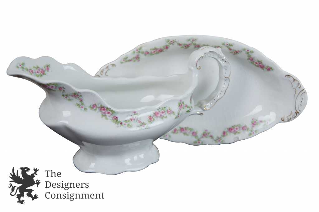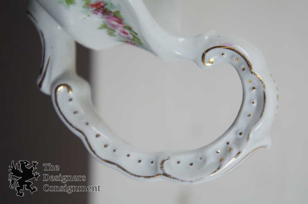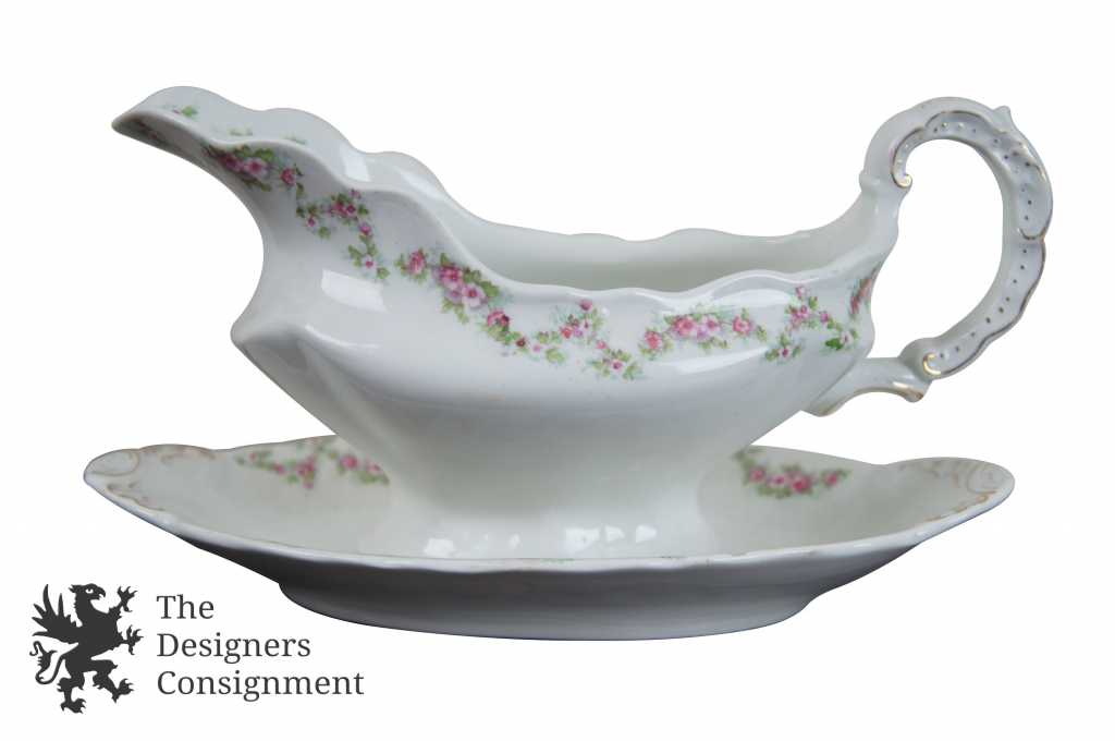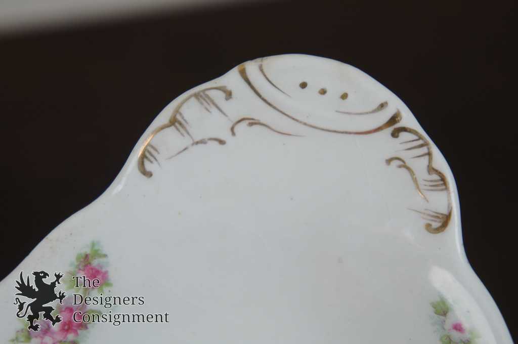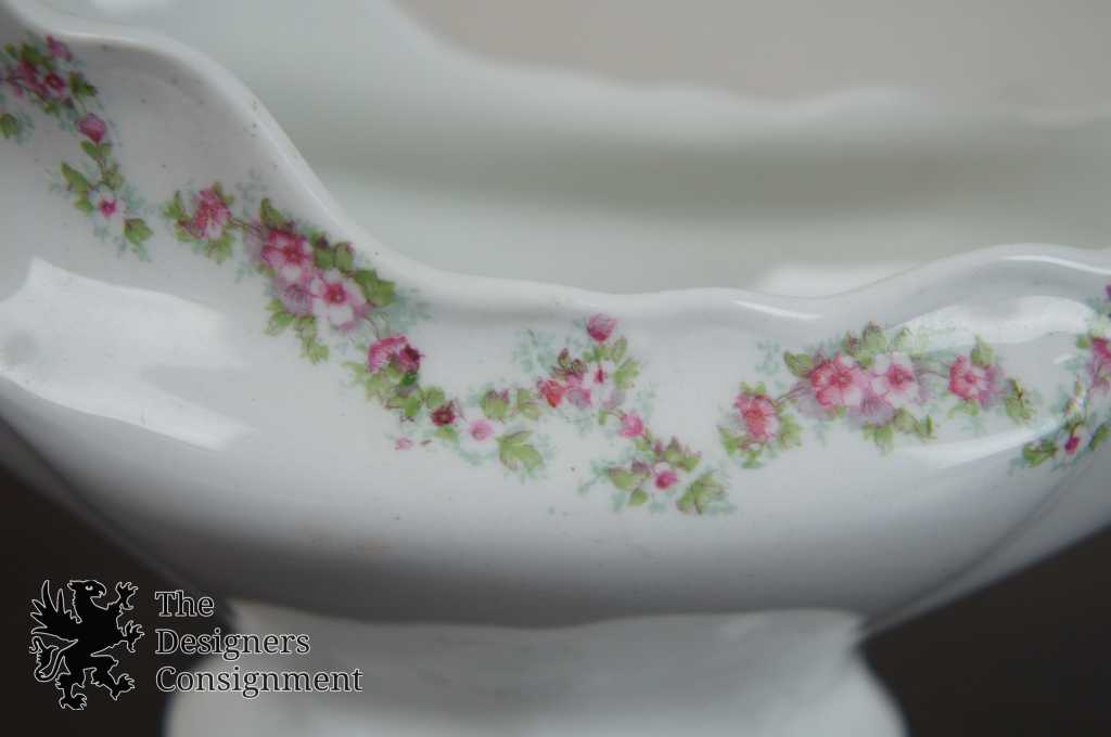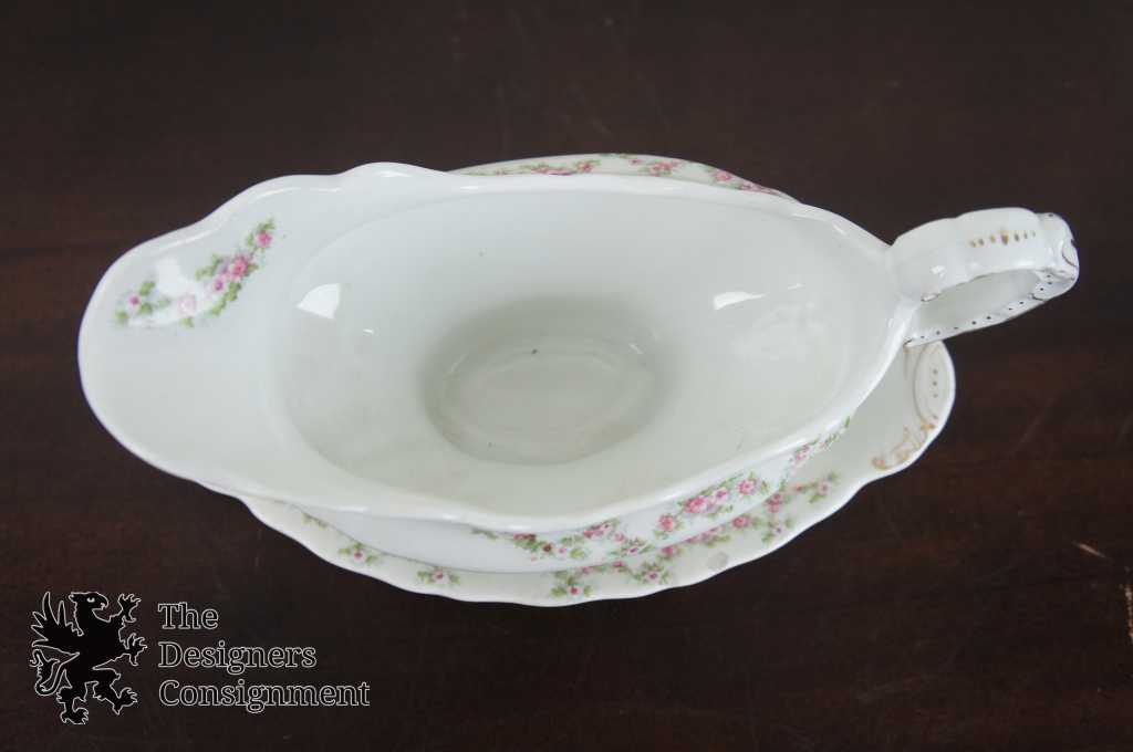 Features fine white china with pink roses and green leaves, has some gold trim as well!