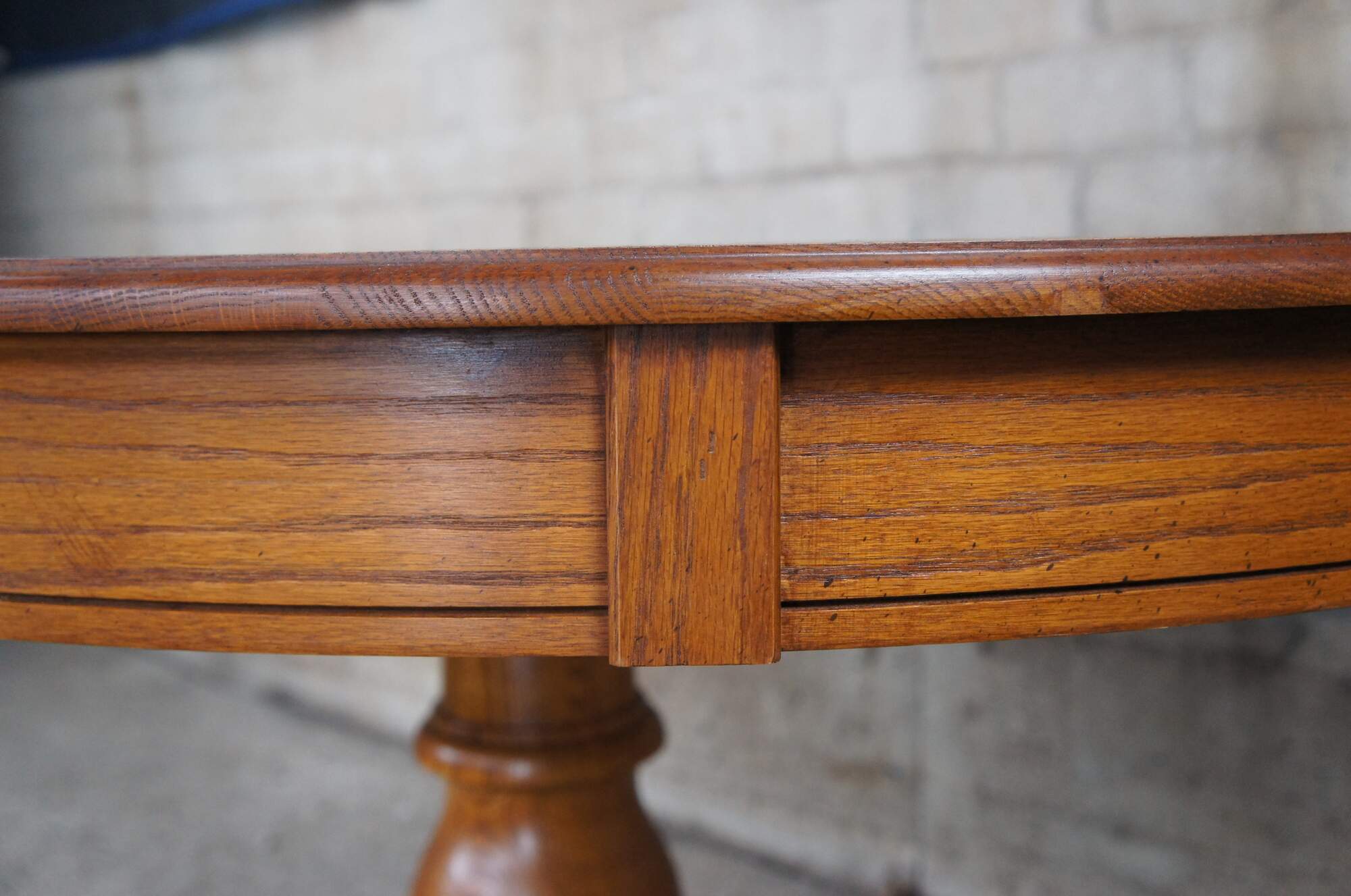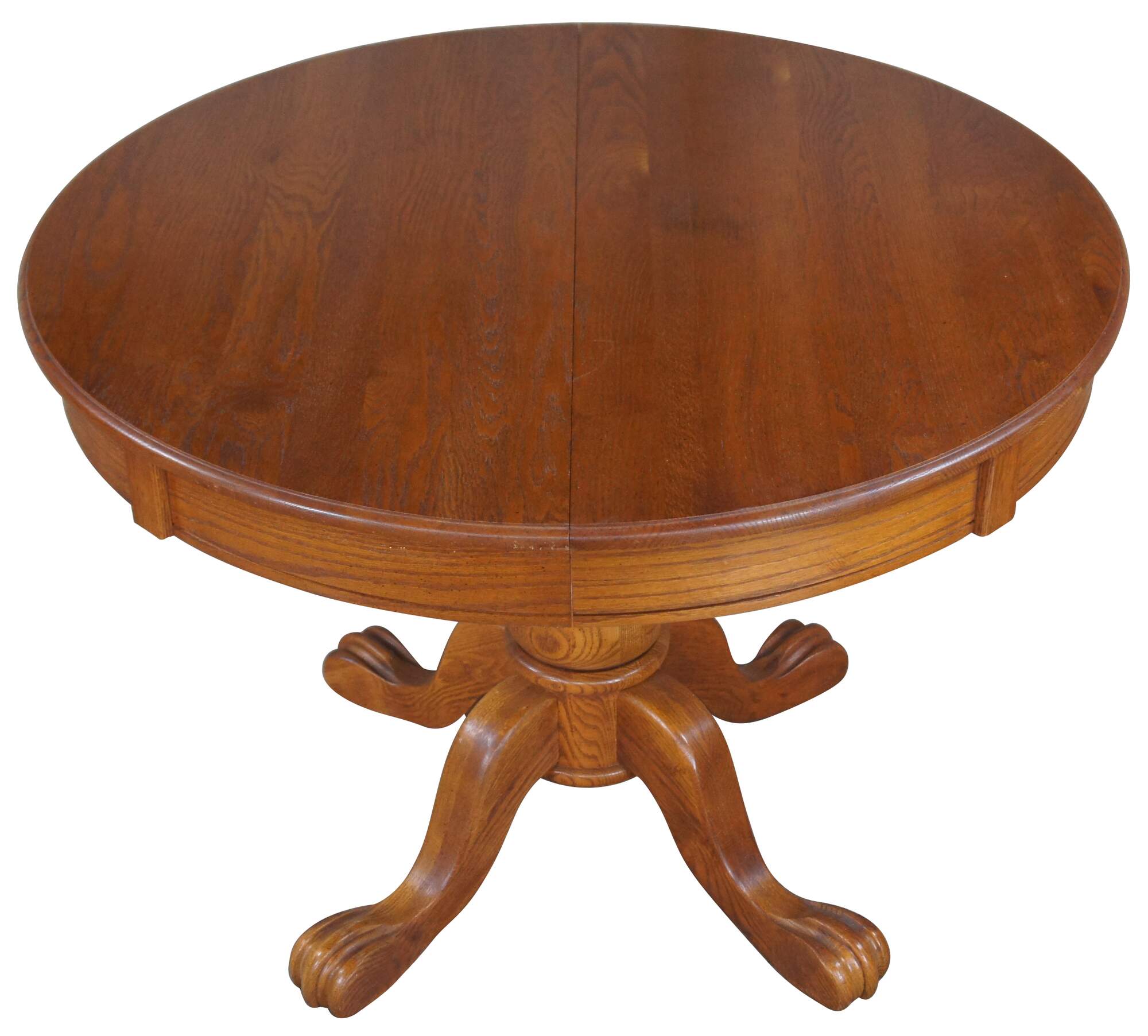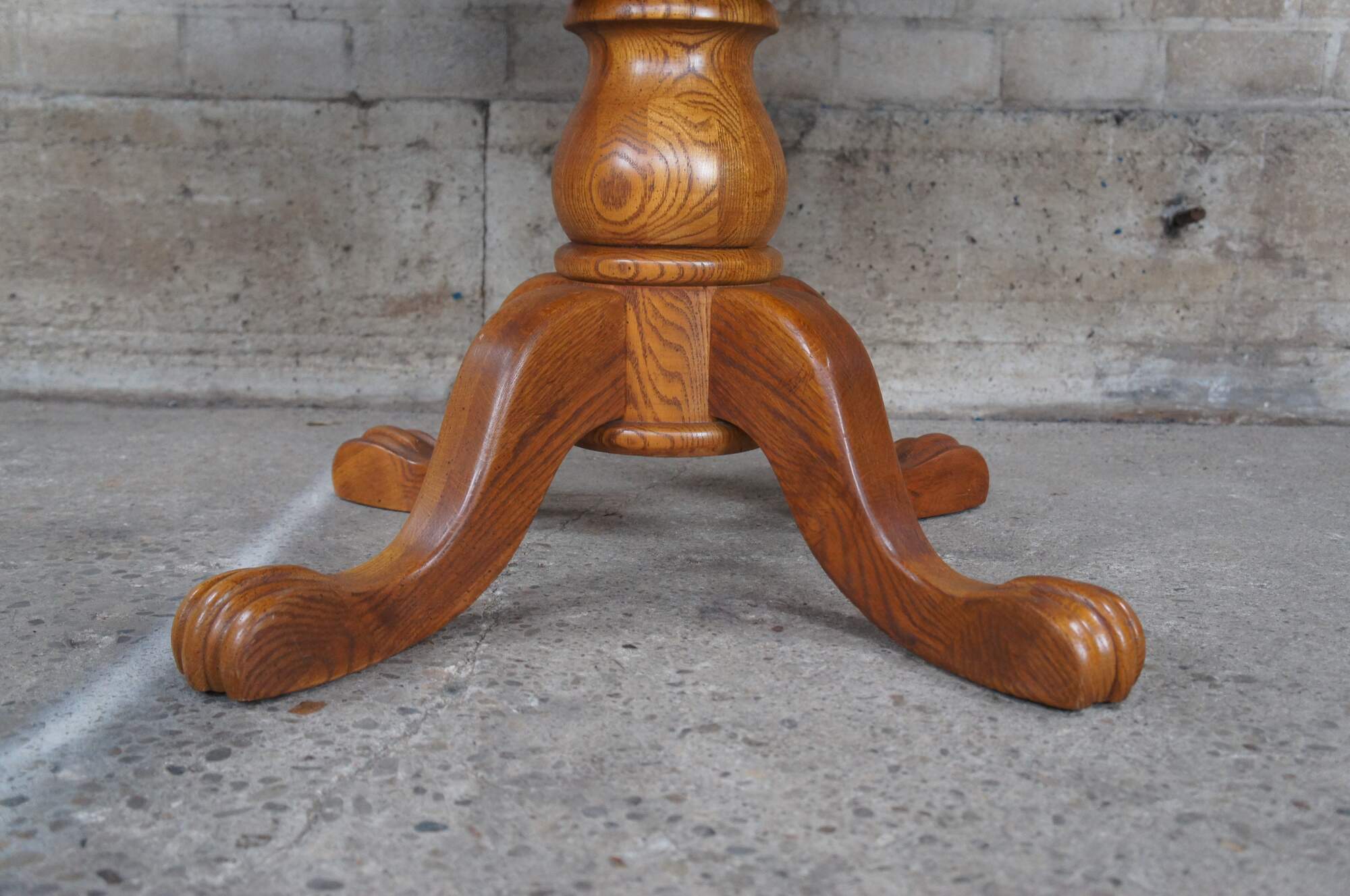 Victorian Revival oak pedestal table, circa 1986. Features a round extendable top over a turned baluster support leading to paw feet.