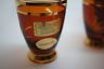 Has a lovely amber cut to clear design with floral etched patterns and gold trim, has a nice solid topper with gold trim as well.