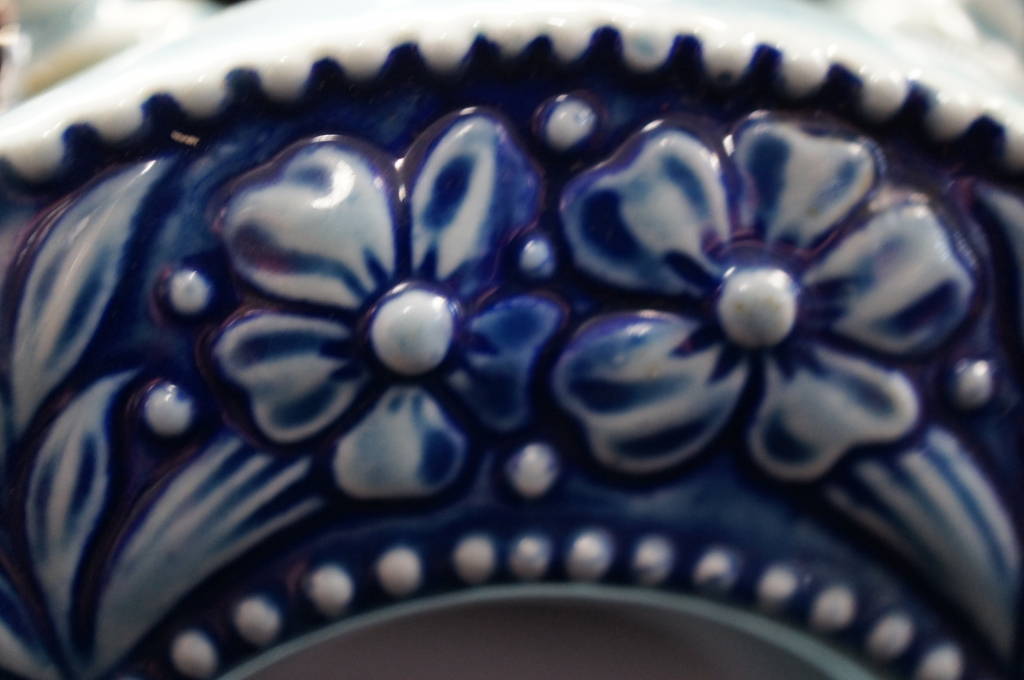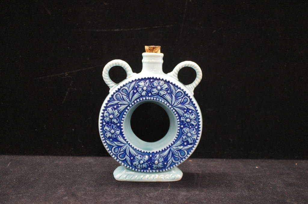 Lovely Blue Antique Porcelain Round Handled Donut Shaped Floral Flask Decanter