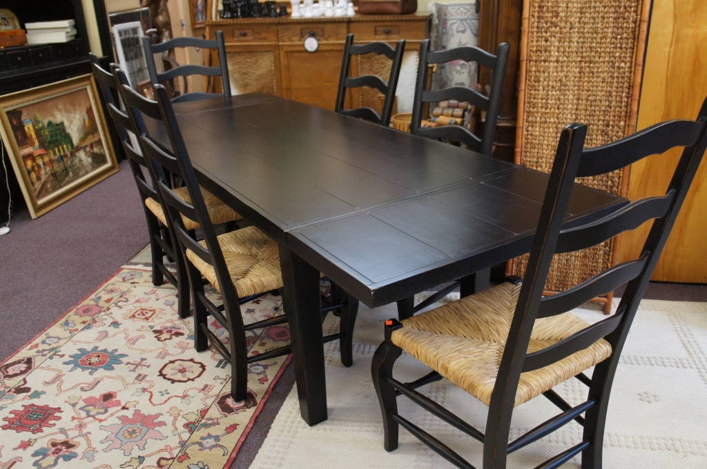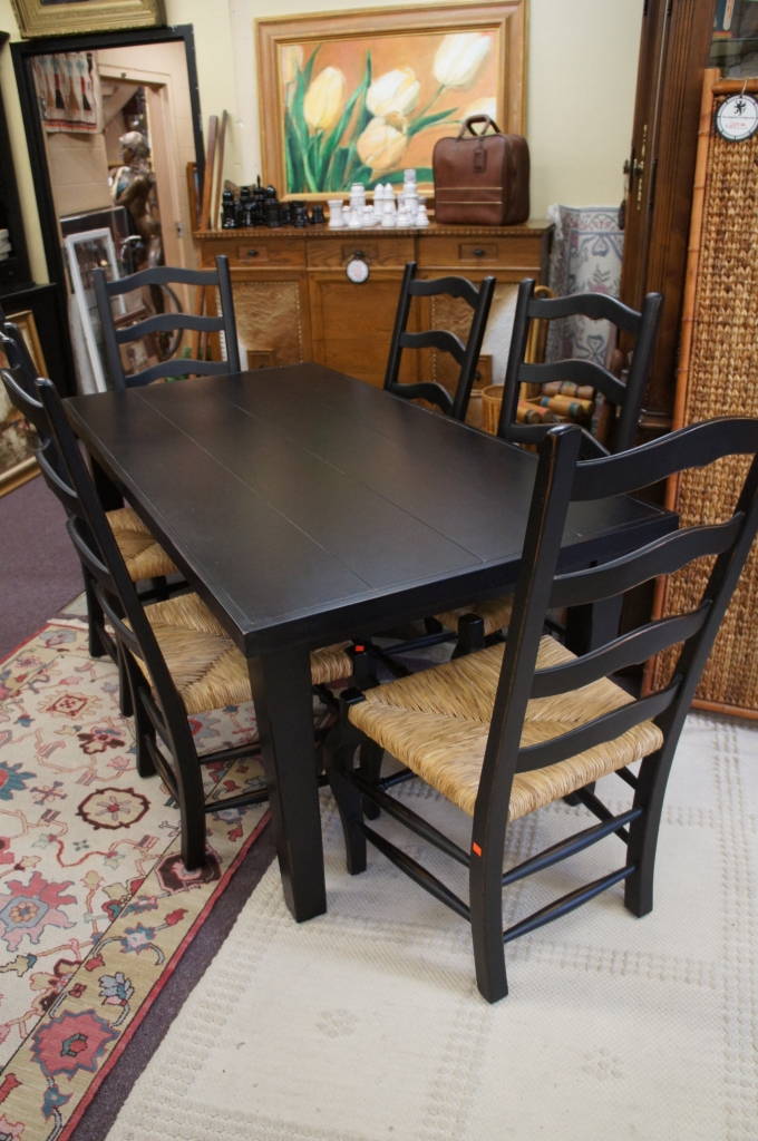 Black Rustic Dining Table 6 Rushed Ladder Back Chairs Seats Wood Country Style
