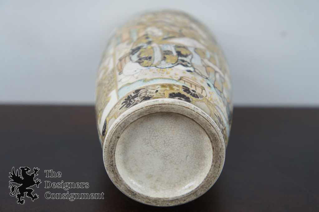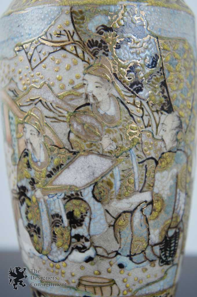 This is a beautiful piece that we believe is Satsuma Ware from Japan. It depicts Japanese figures that appear to be scribes and are decorated with yellow, blue, and black glazes as well as gold trim to them. These are absolutely gorgeous pieces and they would make wonderful additions to your home or collection.