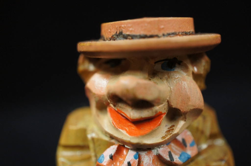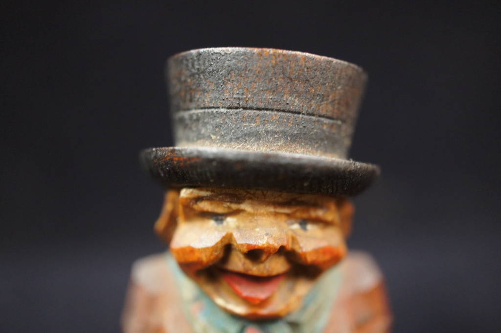 2 Antique Hand Carved Miniature Wood Figurine Men w/ Smiling Top Hats 2.5" Tall