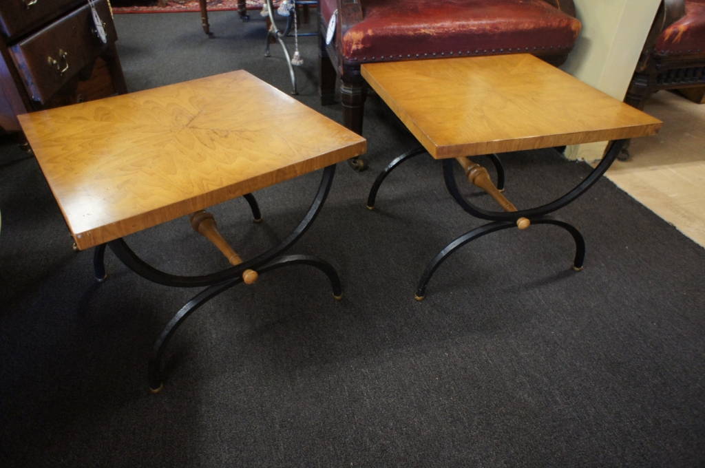2 Vintage Pavane by Tomlinson Square Wood End Tables Iron Legs Hollywood Regency