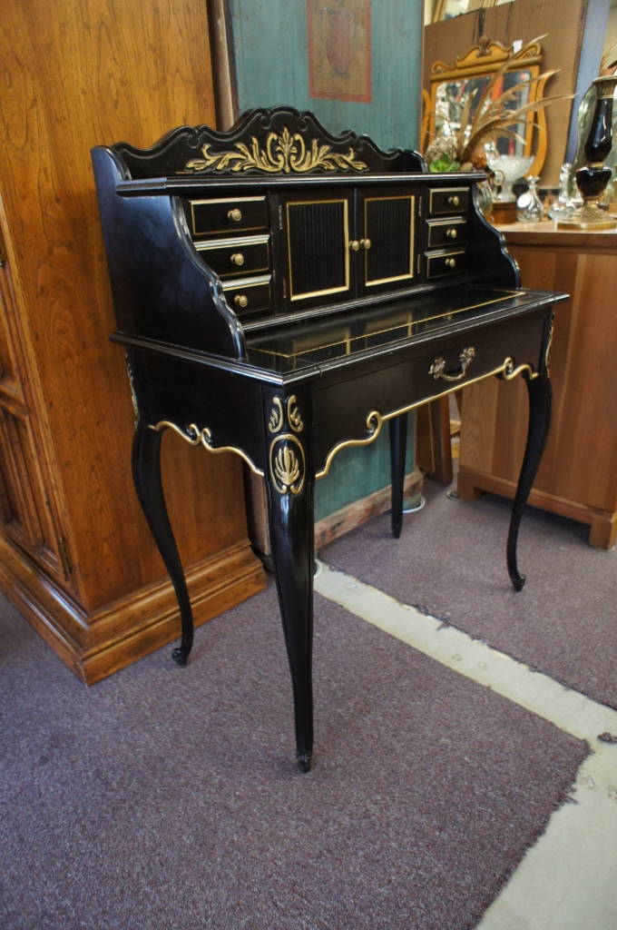 Black Lacquer Secretary Desk Gold Trim Ebony Chippendale Style Cabriole Leather