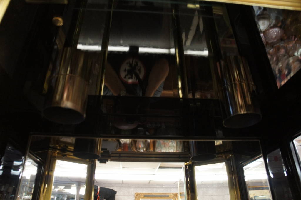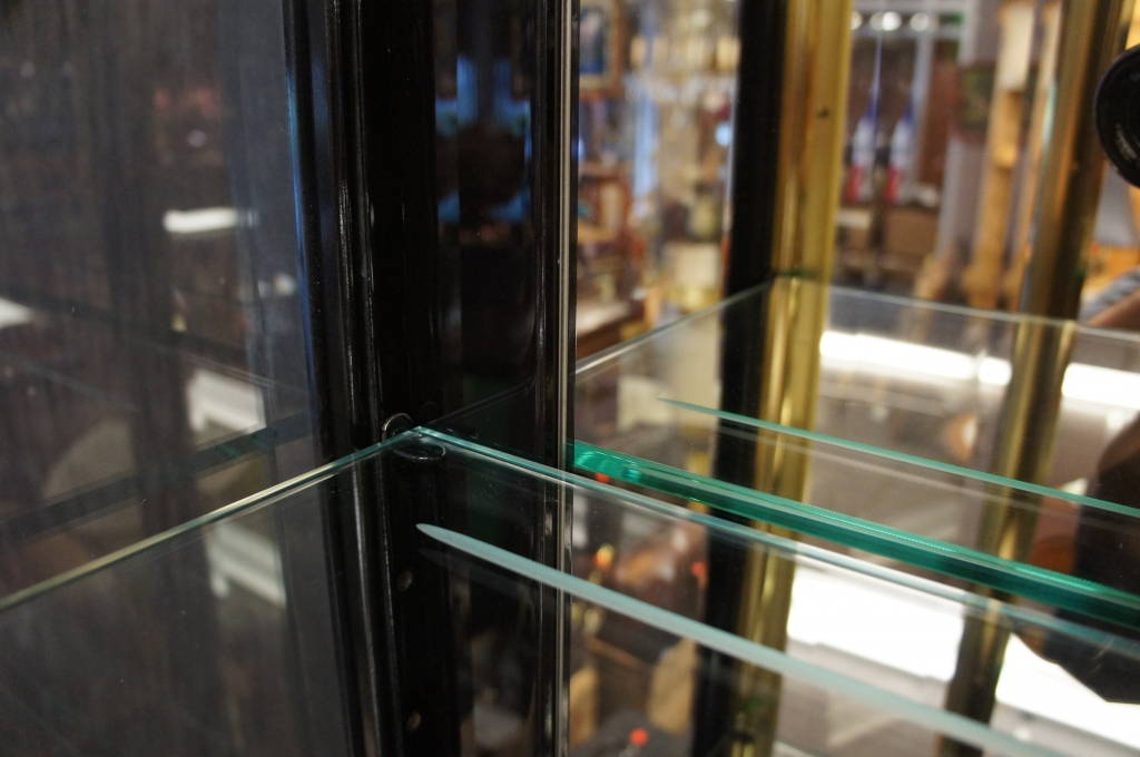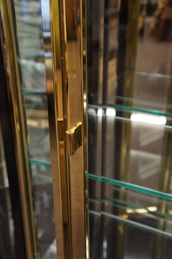 2 Contemporary Black Lacquer & Brass Henredon Lit Display Cabinets Beveled Glass