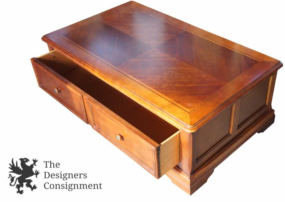 Traditional coffee table with drawer and parquetry finish. Features a distressed finish.