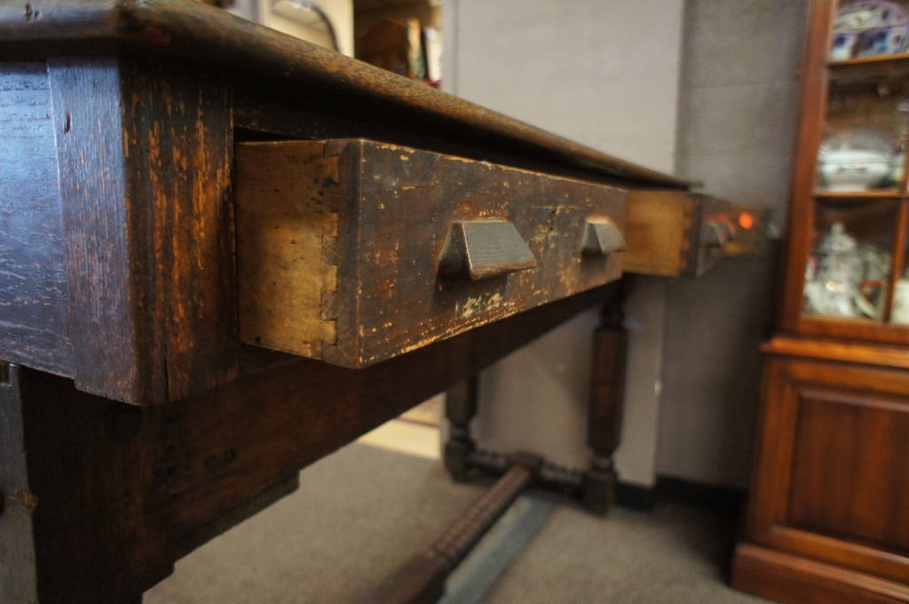 Large 1880s Shipping Desk Work Bench Trestle Table 3 Drawer Turned Slant Top