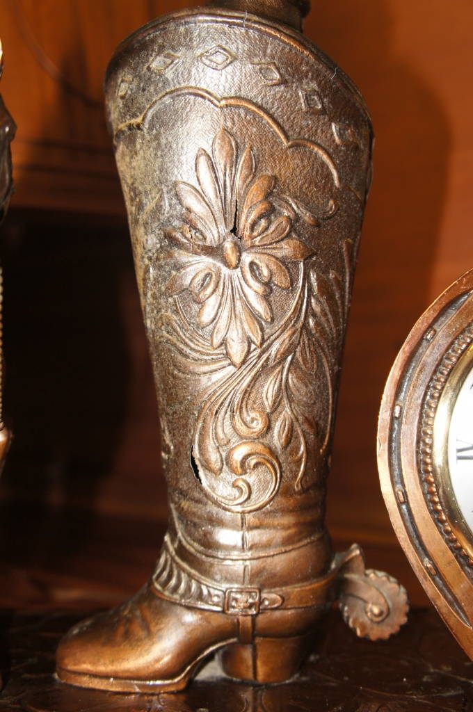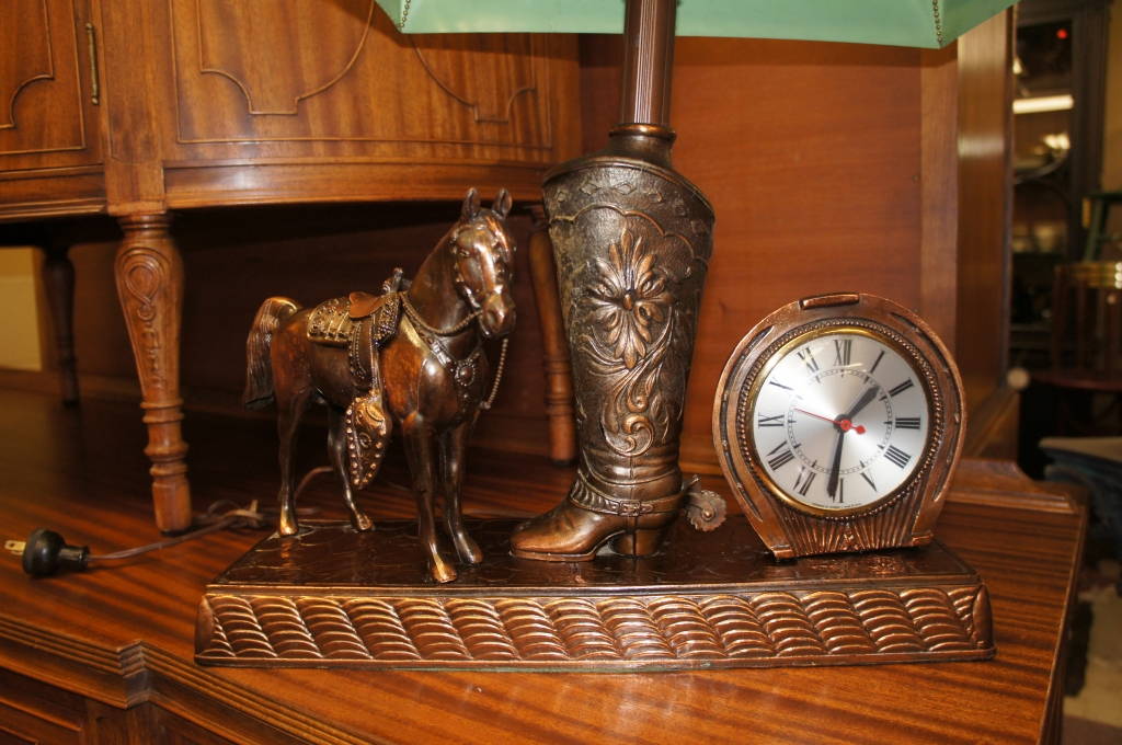 Mid Century Rustic Cowboy Boot Horseshoe Clock & Lamp W/ Horse Cascading Shade
