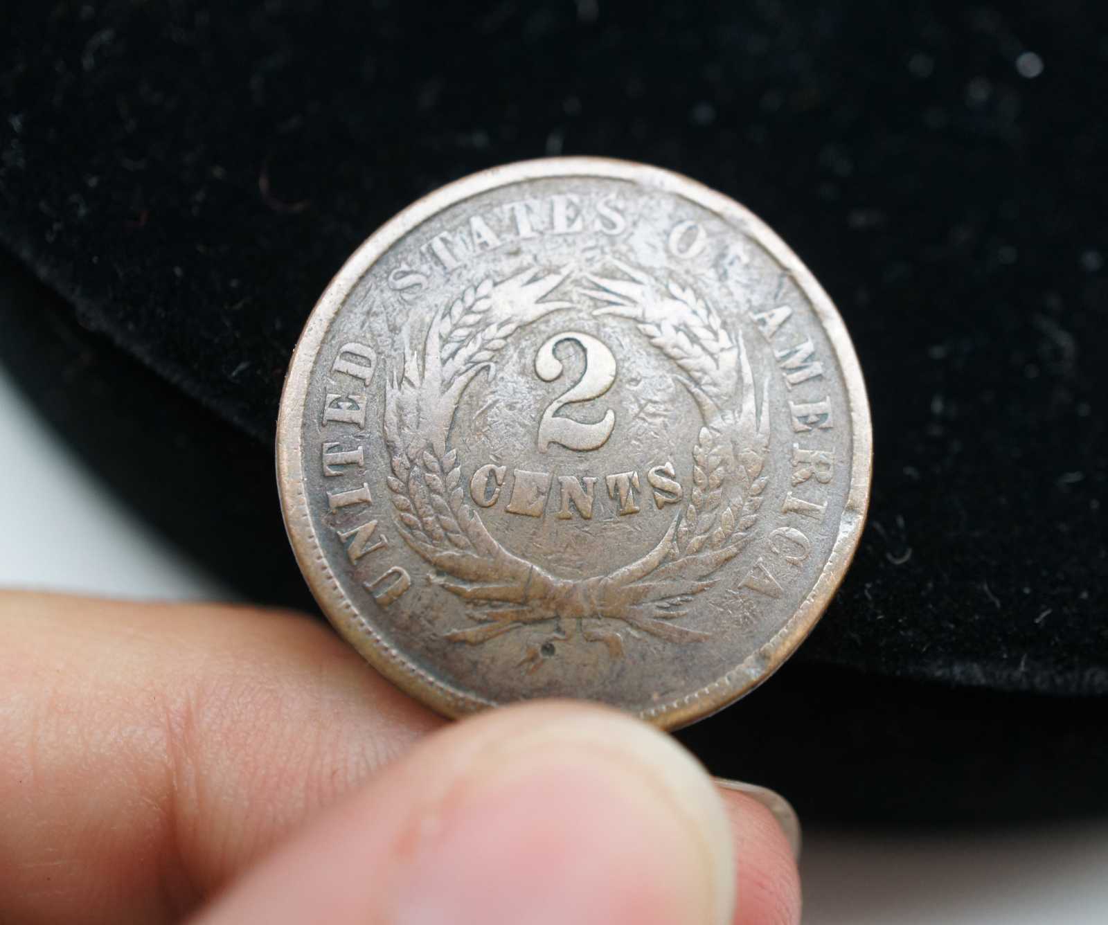Pair of 1864 United States of America two cent coins. The face feature s a striped shield surmounted by a laurel wreath and the traditional motto “In God We Trust. The reverse shows the currency amount surrounded by a wreath of wheat stalks.