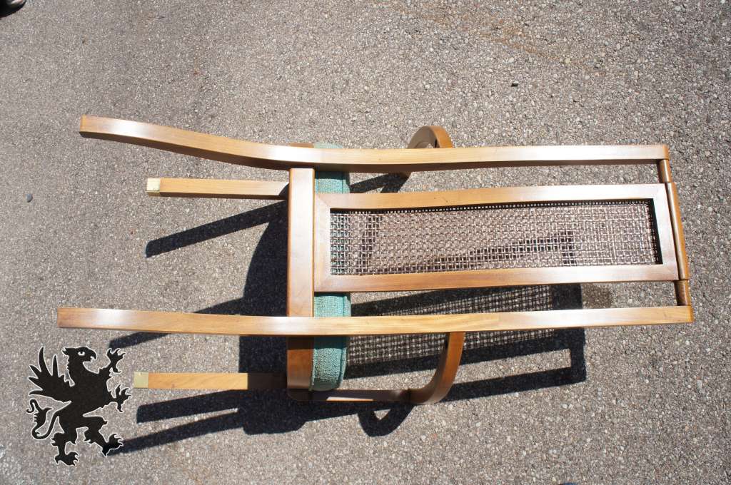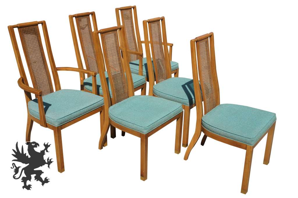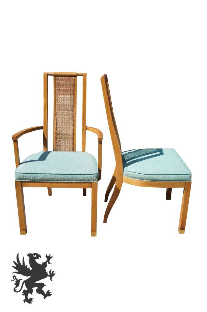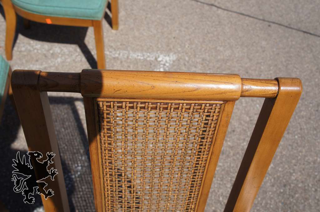 This is a beautiful mid century dining set made by Hickory Furniture Company. The chairs are a vintage teal with a wicker back, while the table is finished in an amazing geometric parquetry design. Two leaves are included. A great addition to any home.