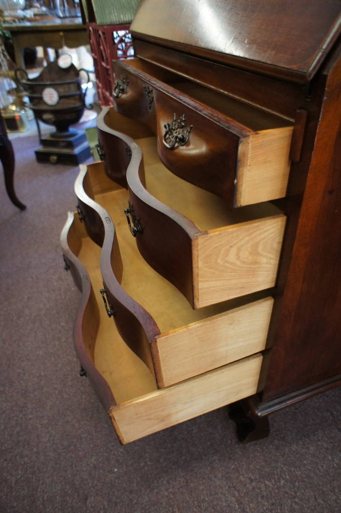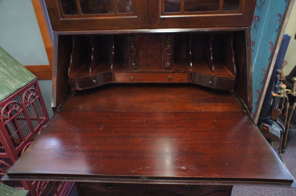 Antique Drop Front Secretary Ox Bow Curved Drawers Glass Door Display Cabinet