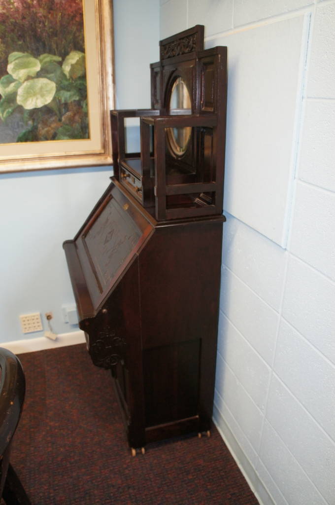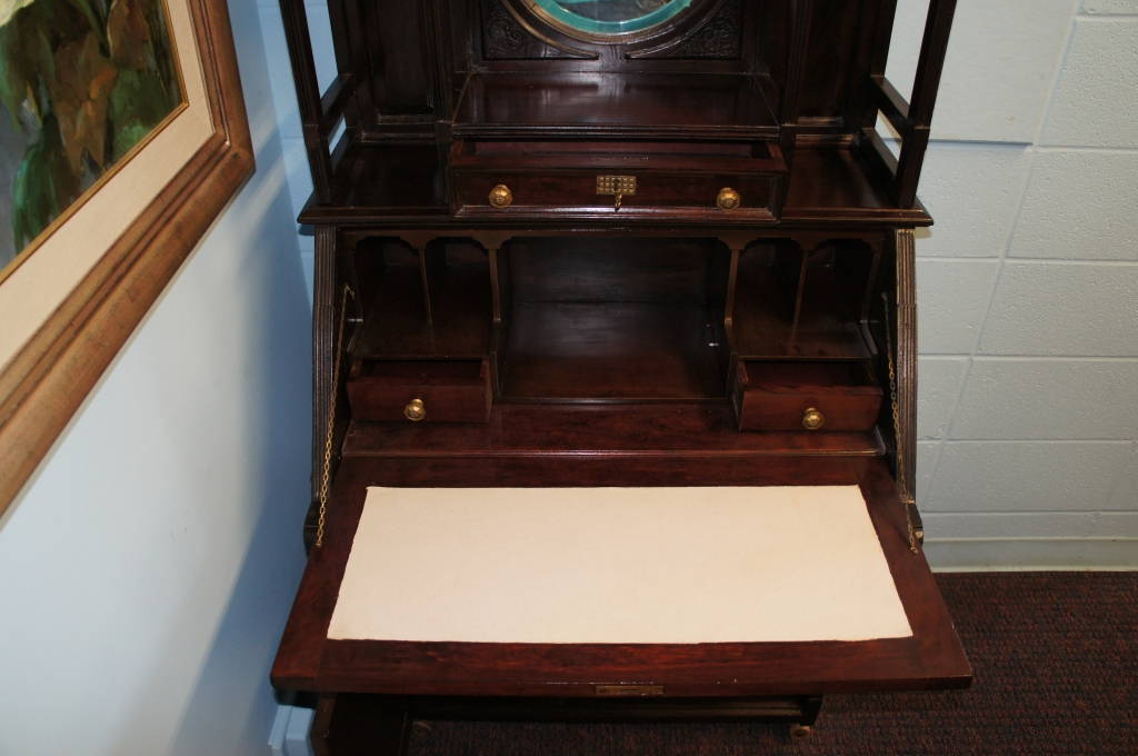 Antique 19th Century Carved Secretary W/ Wooden Casters & Beveled Vanity Mirror