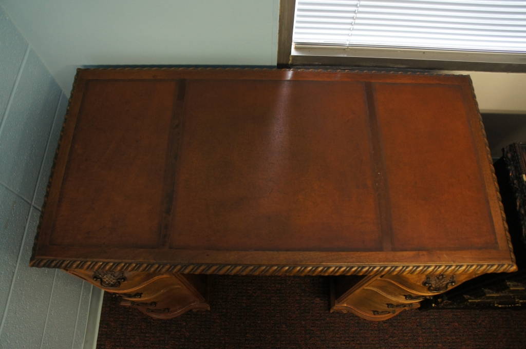 Antique Leather Top Oxbow Desk W/ Ball And Claw Feet Brass Pulls Gadrooning