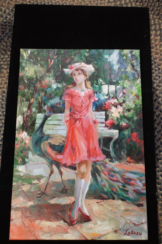 1 Original Fancy Woman & Peacock Impressionist Oil Painting Signed LaBeau , removed