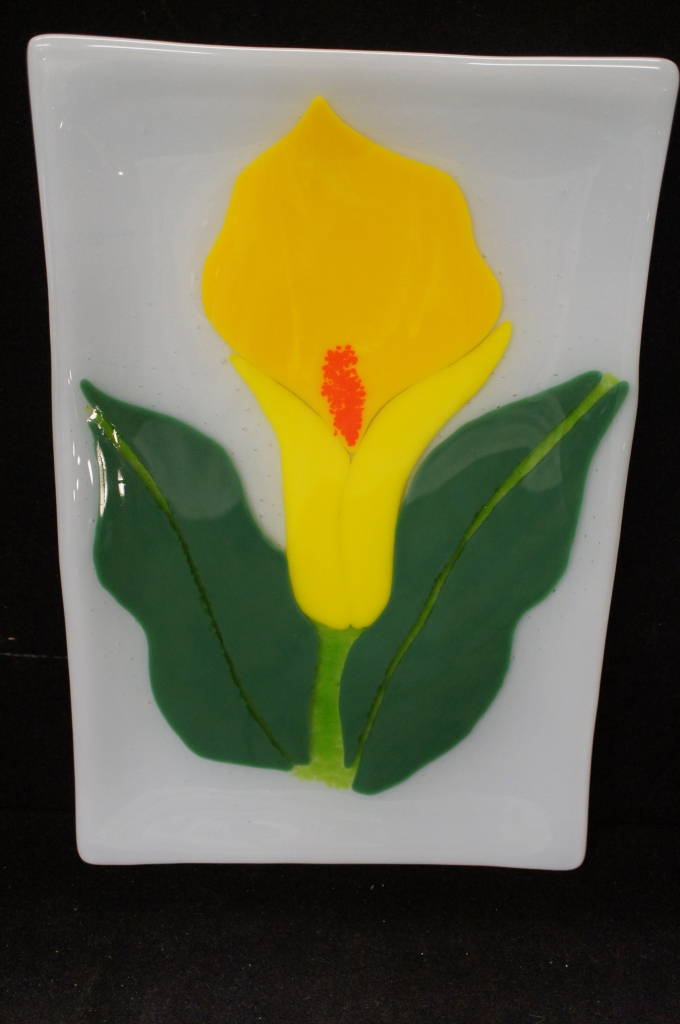 Large Hand Blown White Dish With Yellow Calla Lilly Thick Glass Yellow Flower