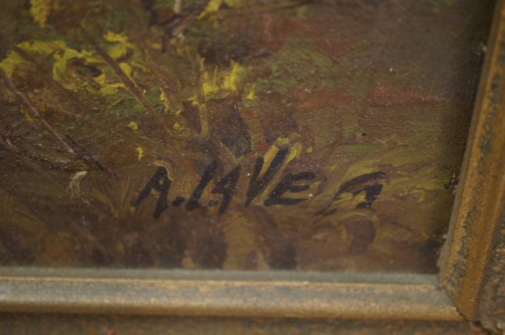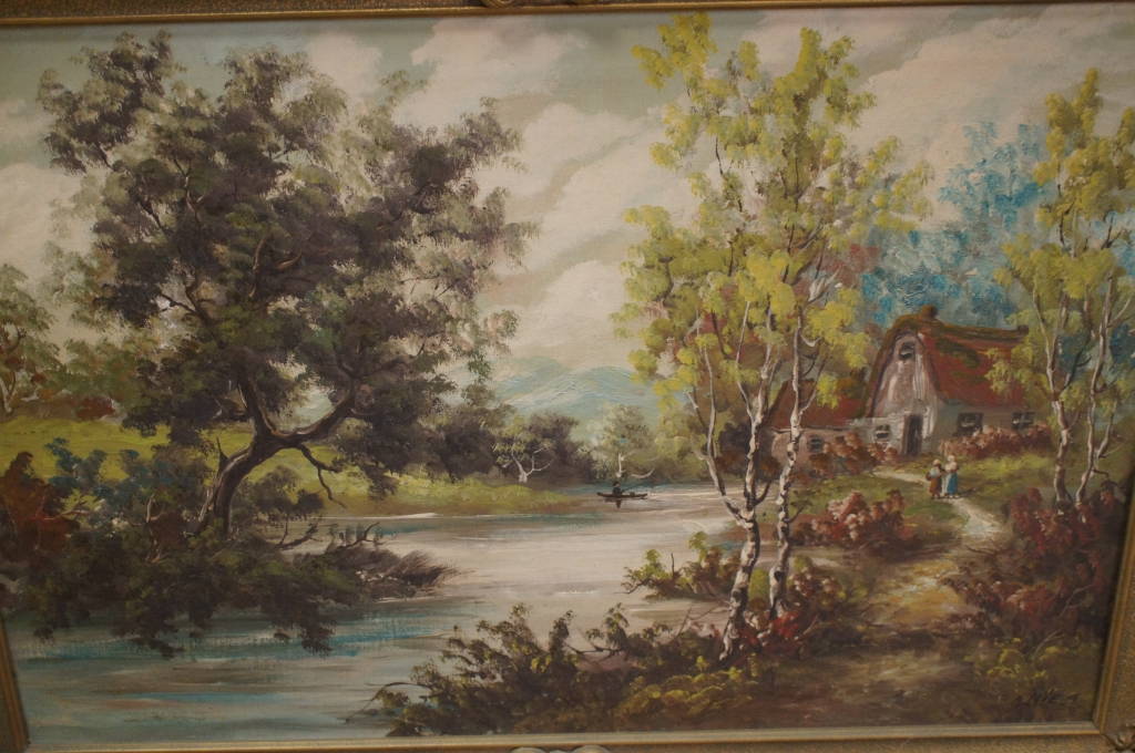 1 Signed A. Lave Cottage Landscape Pond Trees w/ Figures and , removed
