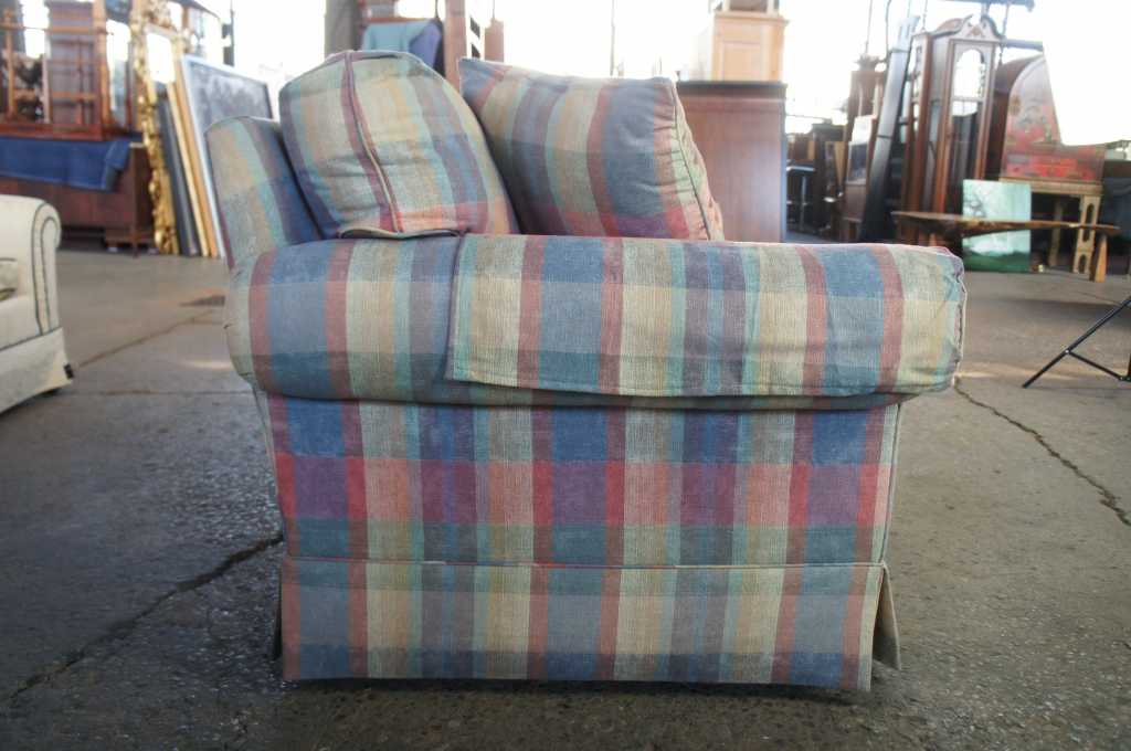 1990s Sherrill Furniture plaid sofa from Elder Beerman. Traditional style with rolled arms and two throw pillows. Yellows, blues, reds.