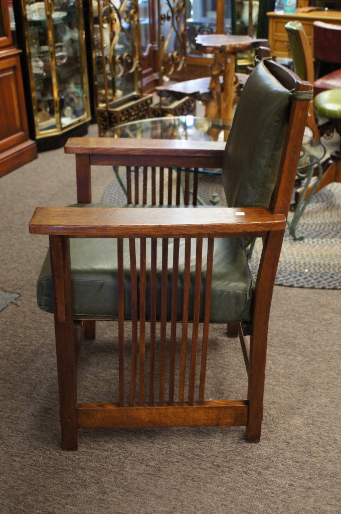 Antique Mission Style Slat Back Arm Chair W/ Green Leather Cushions Stickley?