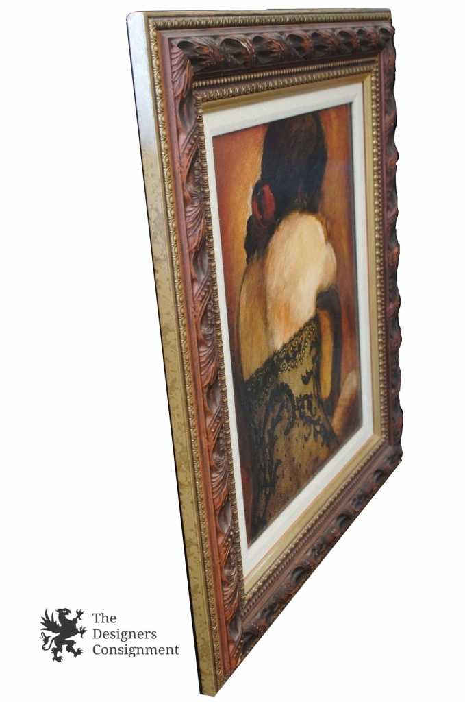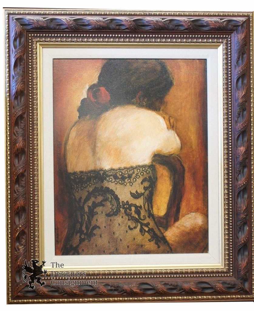 Here is a lovely print on board. Features a woman in a black lacy dress facing backwards on a chair.