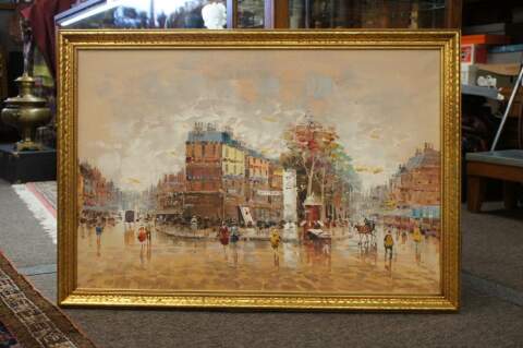 Large Early 20th Century Impressionist Cityscape Oil Painting W/ Gilt Frame