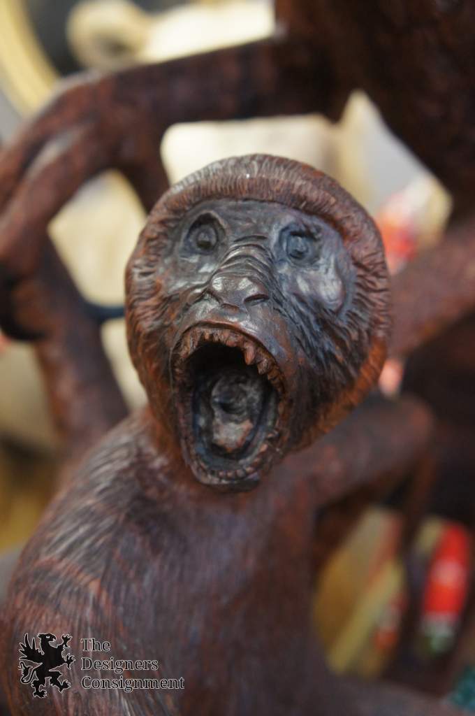An African Crowned Eagle going after a pair of Monkeys. The African Crowned Eagle is thestrongest Eagle in the World. Carved from black walnut. This piece is signed on the base. The block this piece is displayed on is original to the piece and also made by him.