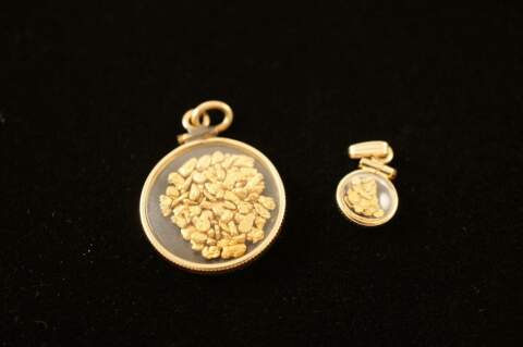 Two 22K Natural Gold Nugget Flake Pendants Clear Round Glass Case