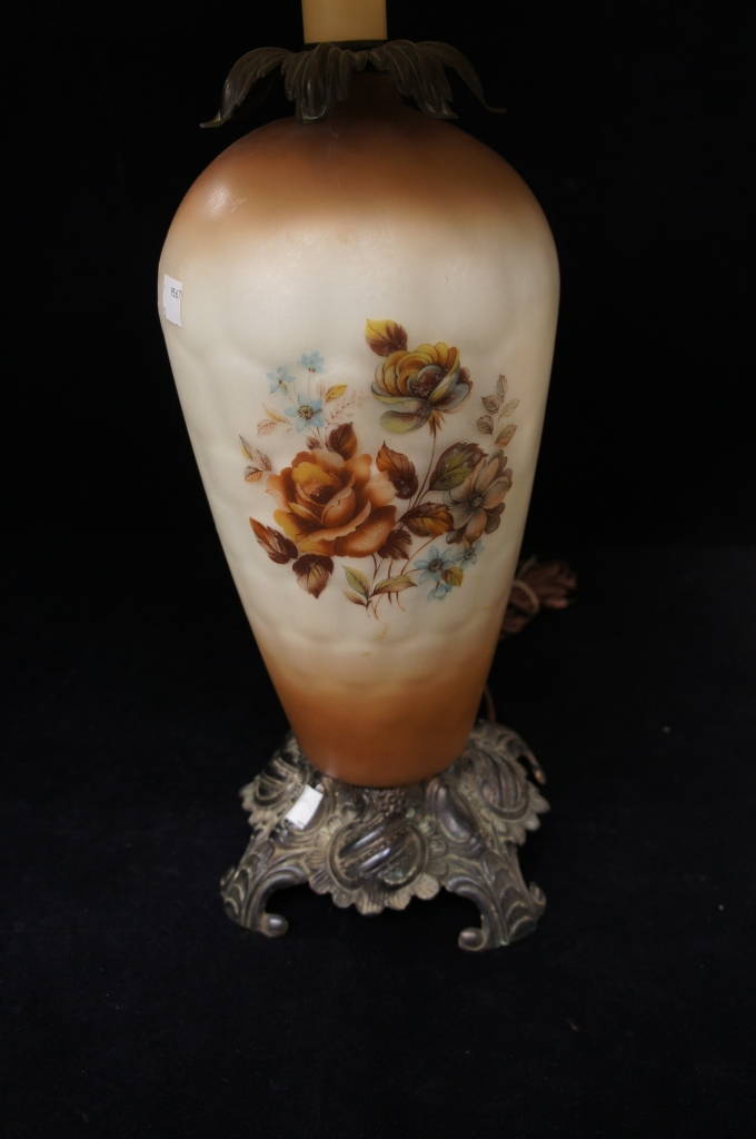 Vintage 29" Handpainted Glass Floral Table Lamp w/ Original Shade Metal Base