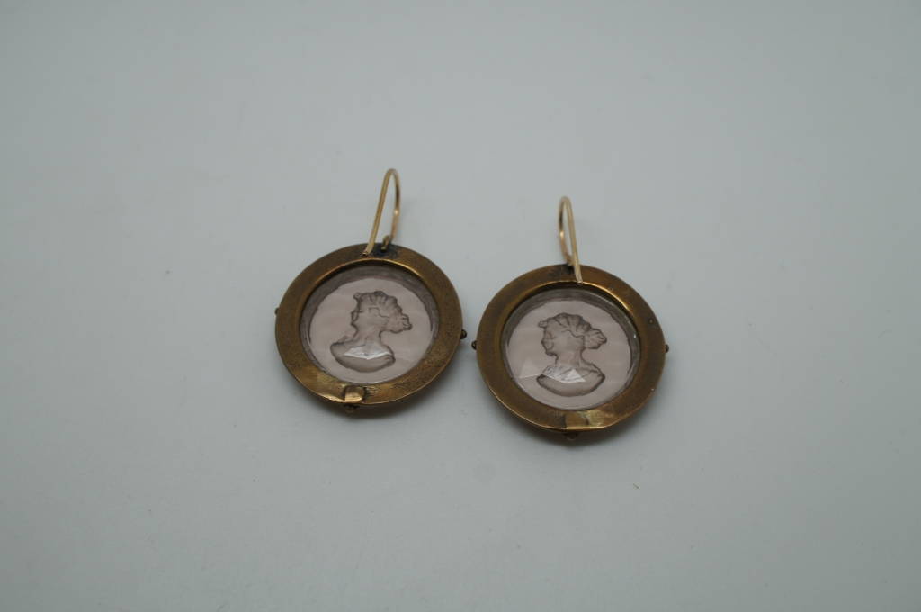 Antique Pair Art Deco Round Cameo Silhouette Jewelry Earrings 1' x 1.5