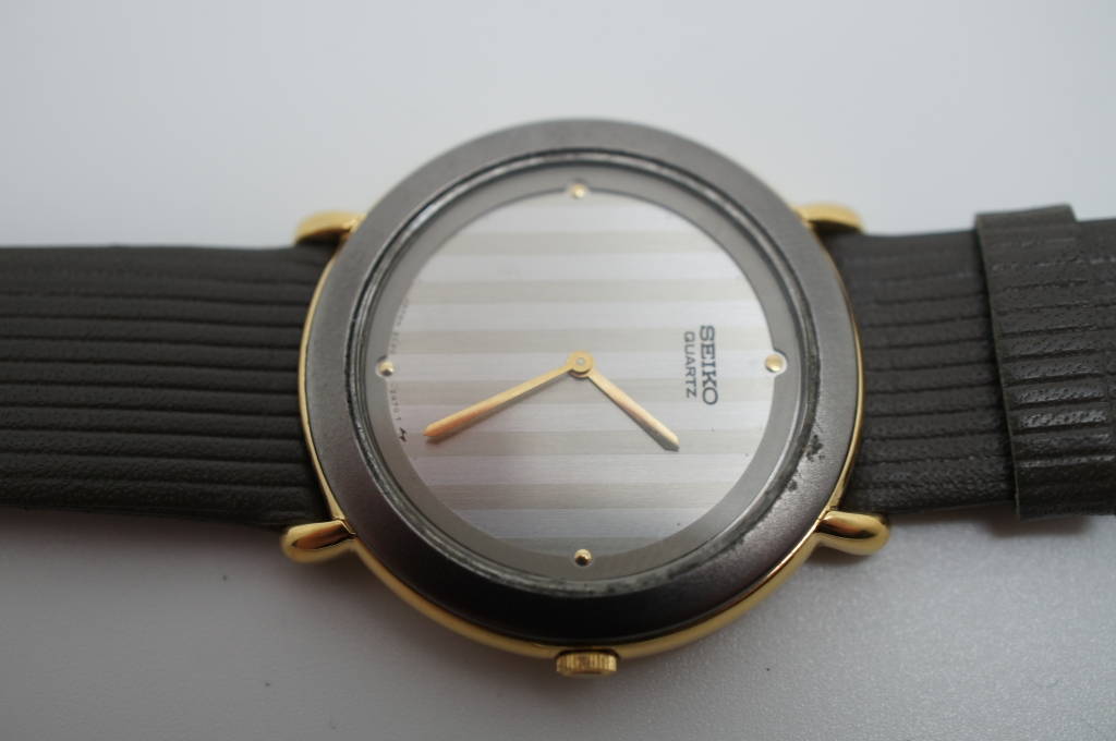 Vintage Mens Grey Striped Seiko Quartz Base Metal Steel Back Watch Rubber Band